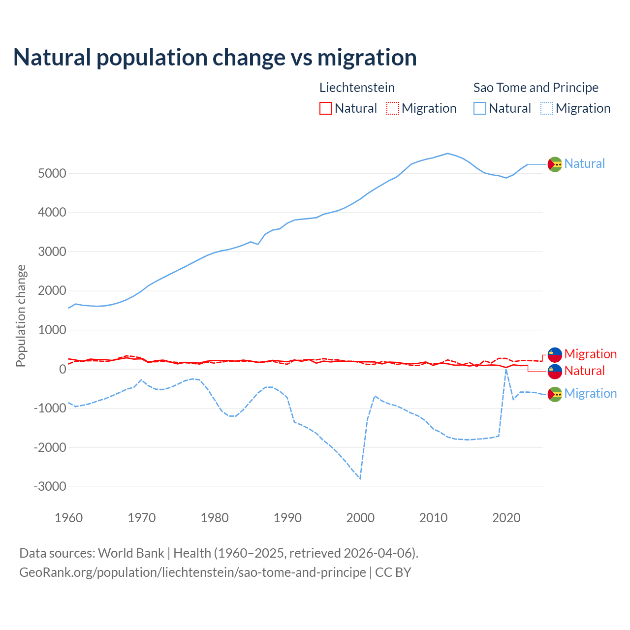 Over the last 10 years, 32.4% of the population change in Liechtenstein is from natural causes (a gain of 883 people) and 67.6% is from migration (a gain of 1,843 people). In Sao Tome and Principe 80.1% is from natural causes (a gain of 50,822 people) and 19.9% is from migration (a loss of 12,621 people).