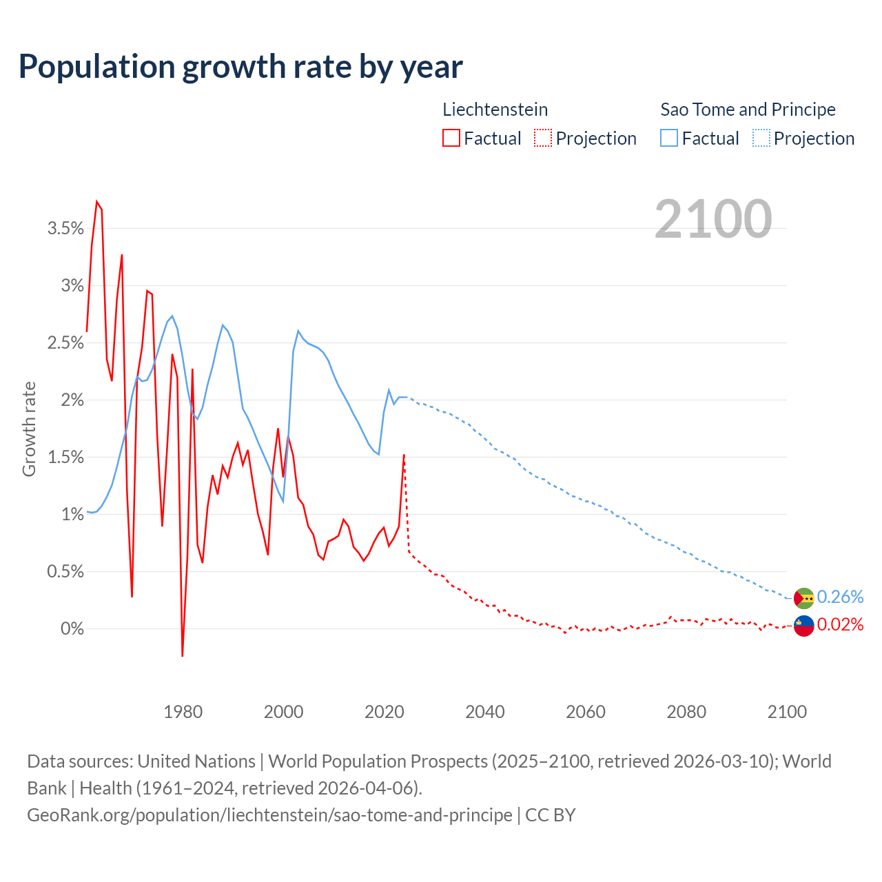 - For the last 10 years, Liechtenstein has had an average growth rate of +0.82% per year vs +1.82% in Sao Tome and Principe.