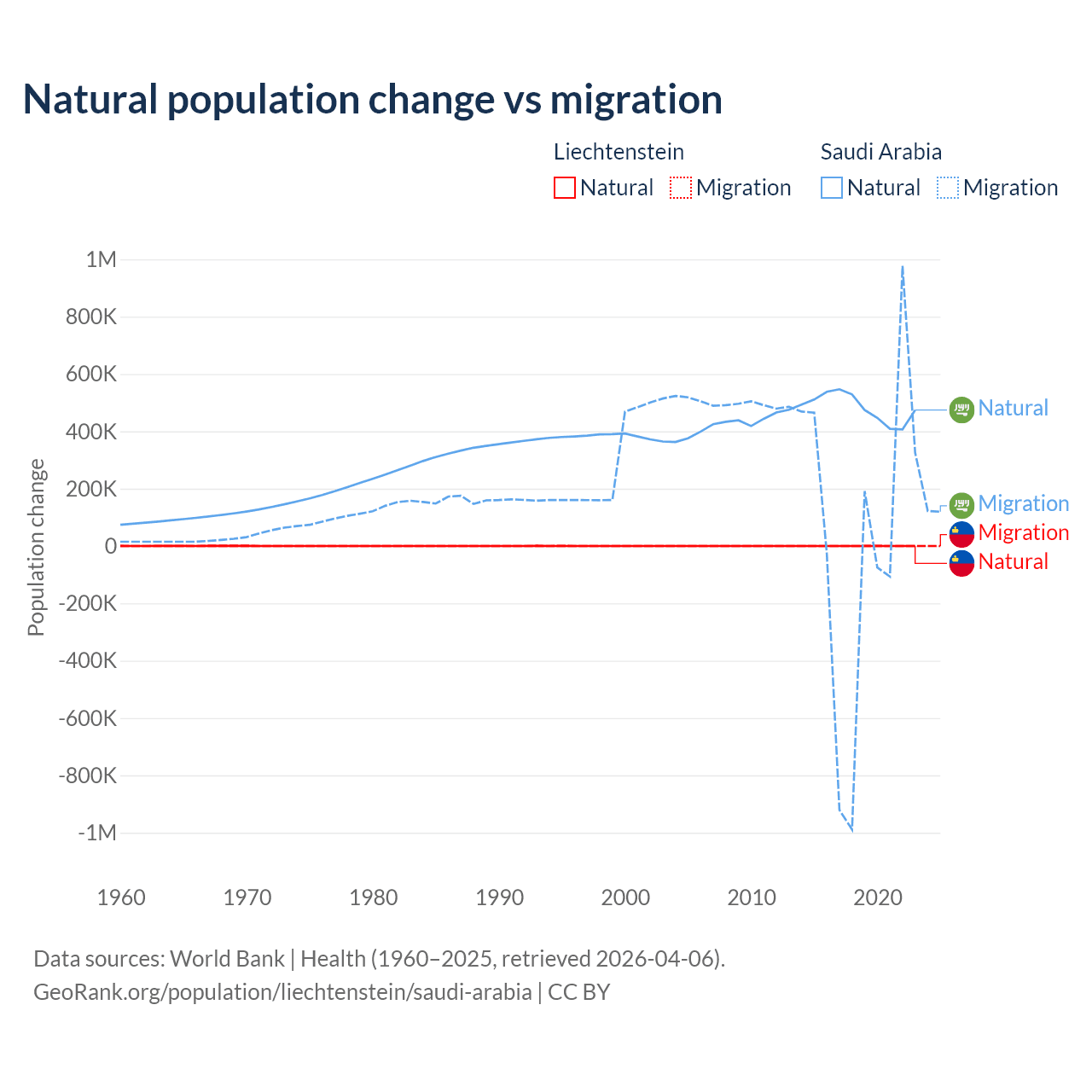 Over the last 10 years, 32.4% of the population change in Liechtenstein is from natural causes (a gain of 883 people) and 67.6% is from migration (a gain of 1,843 people). In Saudi Arabia 93.9% is from natural causes (a gain of 4,829,562 people) and 6.05% is from migration (a gain of 311,209 people).