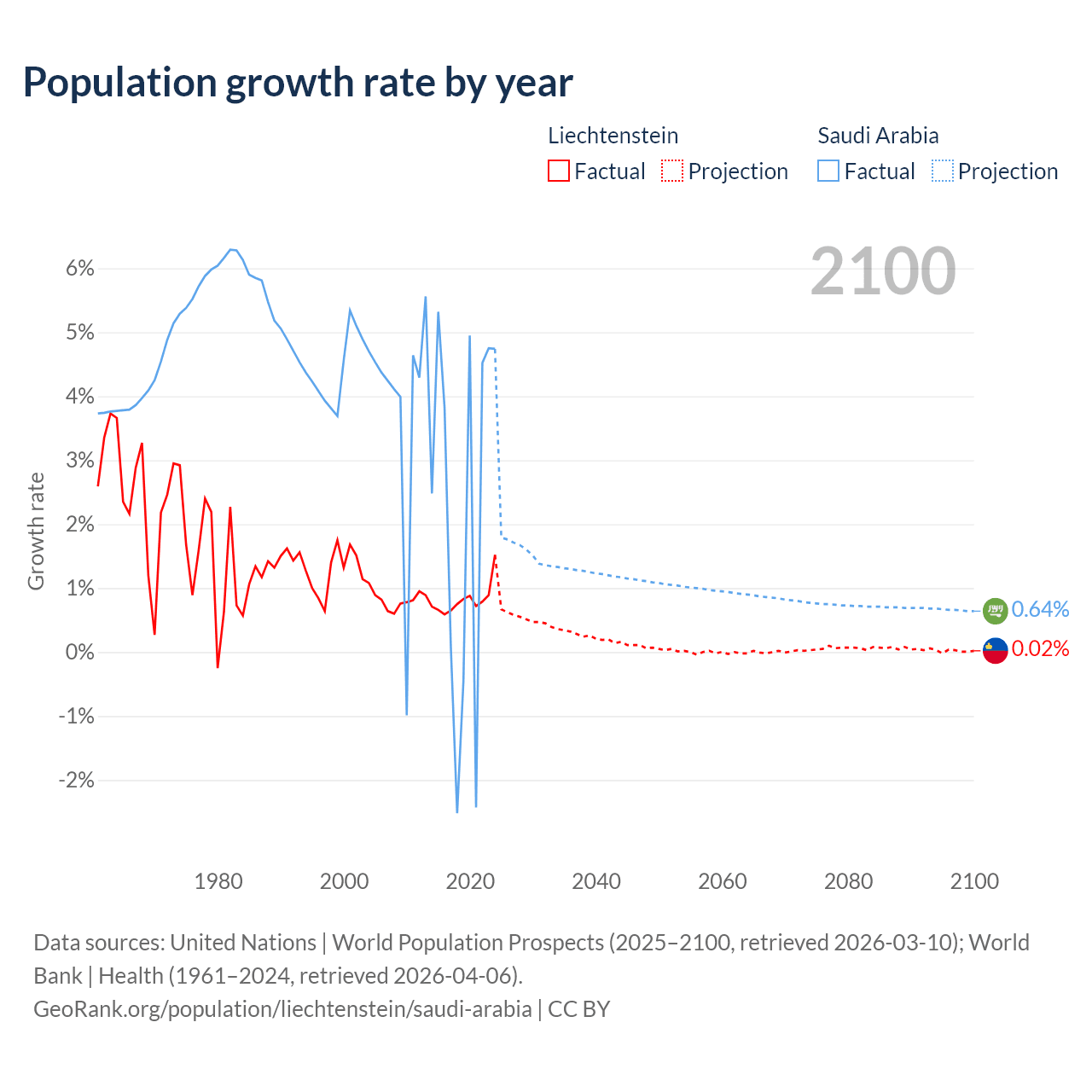 - For the last 10 years, Liechtenstein has had an average growth rate of +0.82% per year vs +2.3% in Saudi Arabia.