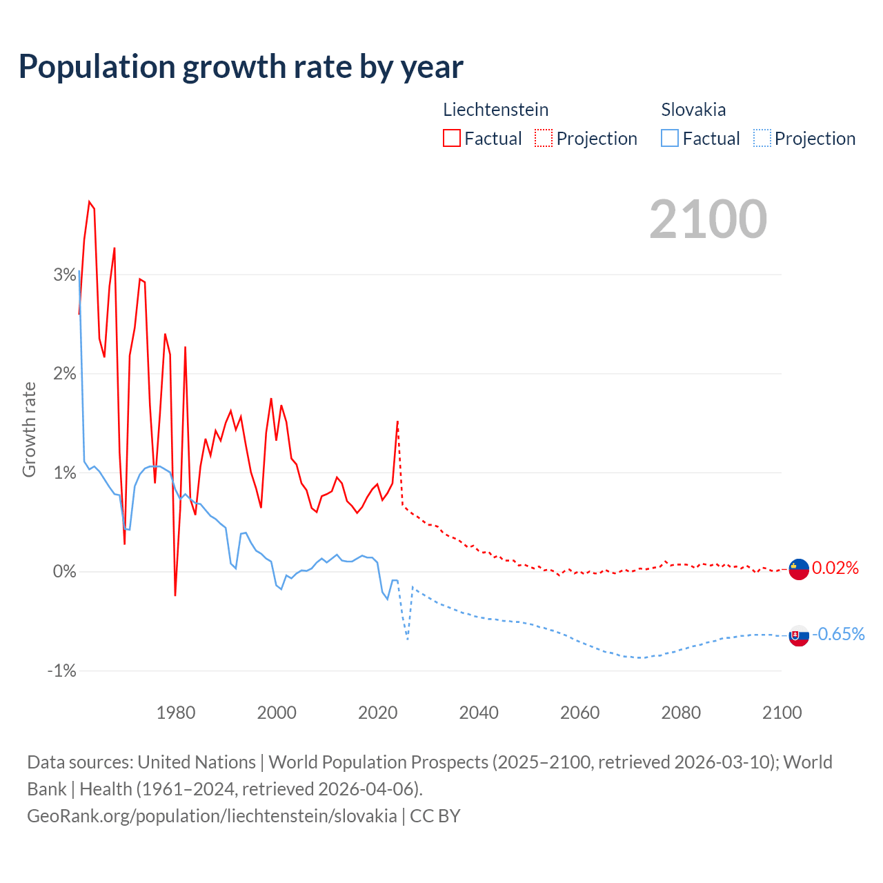 - For the last 10 years, Liechtenstein has had an average growth rate of +0.82% per year vs +0.01% in Slovakia.