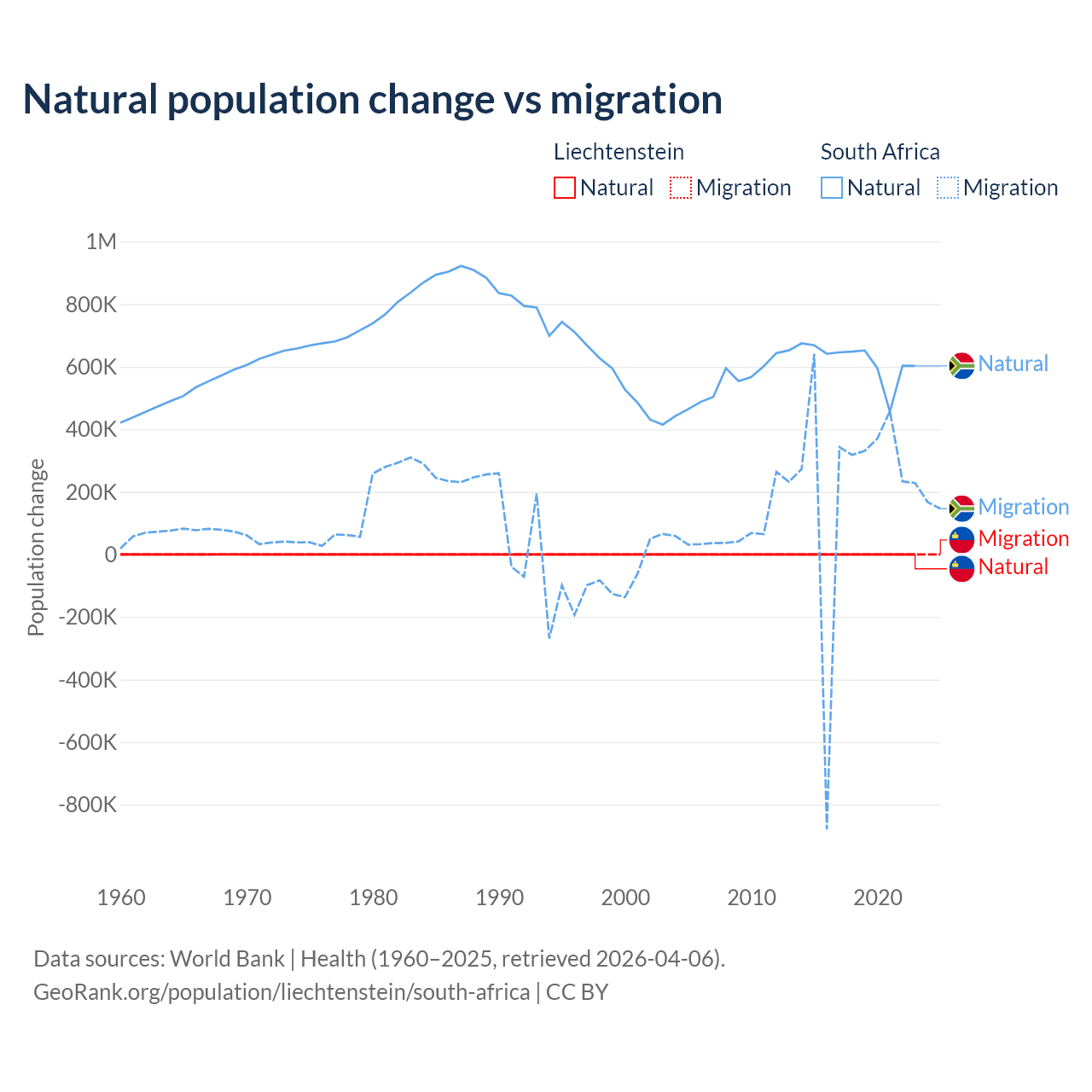 Over the last 10 years, 32.4% of the population change in Liechtenstein is from natural causes (a gain of 883 people) and 67.6% is from migration (a gain of 1,843 people). In South Africa 72.8% is from natural causes (a gain of 6,190,027 people) and 27.2% is from migration (a gain of 2,316,795 people).