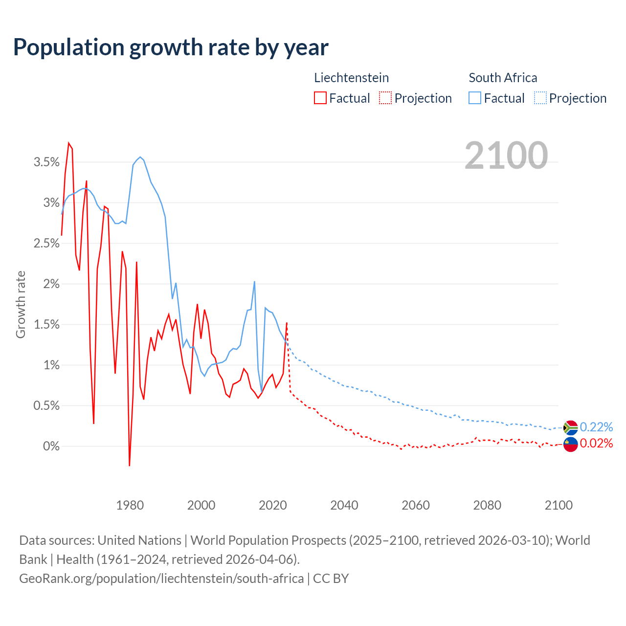 - For the last 10 years, Liechtenstein has had an average growth rate of +0.82% per year vs +1.44% in South Africa.