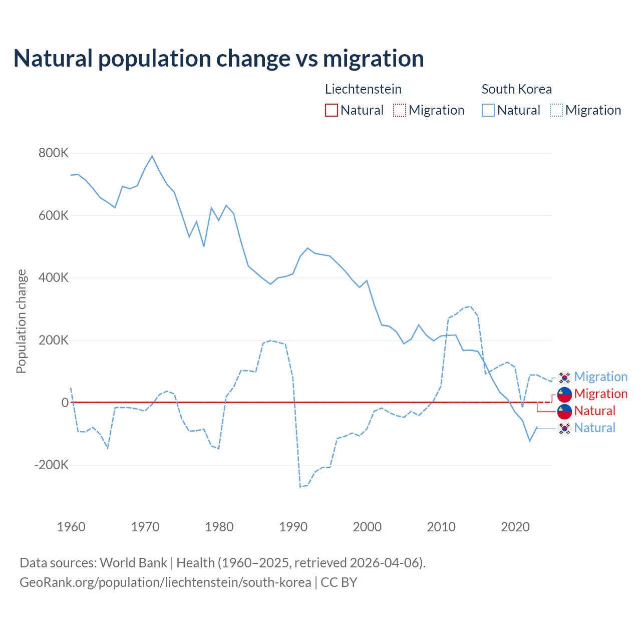 Over the last 10 years, 32.4% of the population change in Liechtenstein is from natural causes (a gain of 883 people) and 67.6% is from migration (a gain of 1,843 people). In South Korea 17.6% is from natural causes (a gain of 277,215 people) and 82.4% is from migration (a gain of 1,298,356 people).