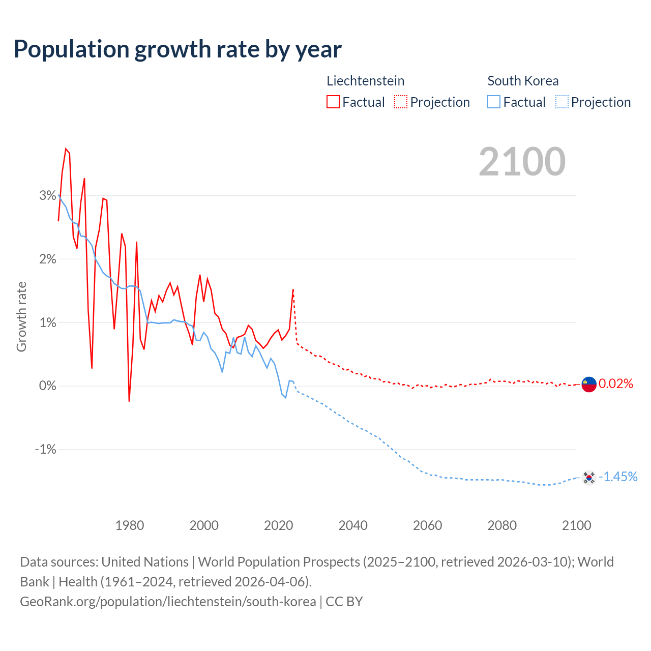 - For the last 10 years, Liechtenstein has had an average growth rate of +0.82% per year vs +0.24% in South Korea.