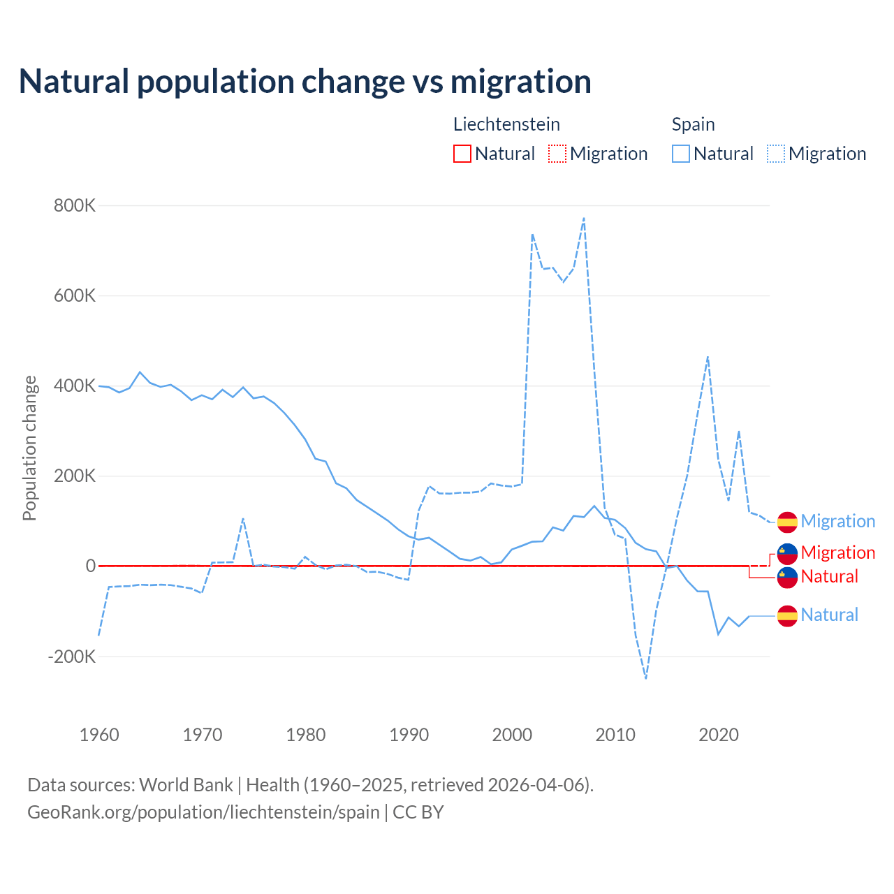 Over the last 10 years, 32.4% of the population change in Liechtenstein is from natural causes (a gain of 883 people) and 67.6% is from migration (a gain of 1,843 people). In Spain 25.8% is from natural causes (a loss of 627,829 people) and 74.2% is from migration (a gain of 1,810,127 people).