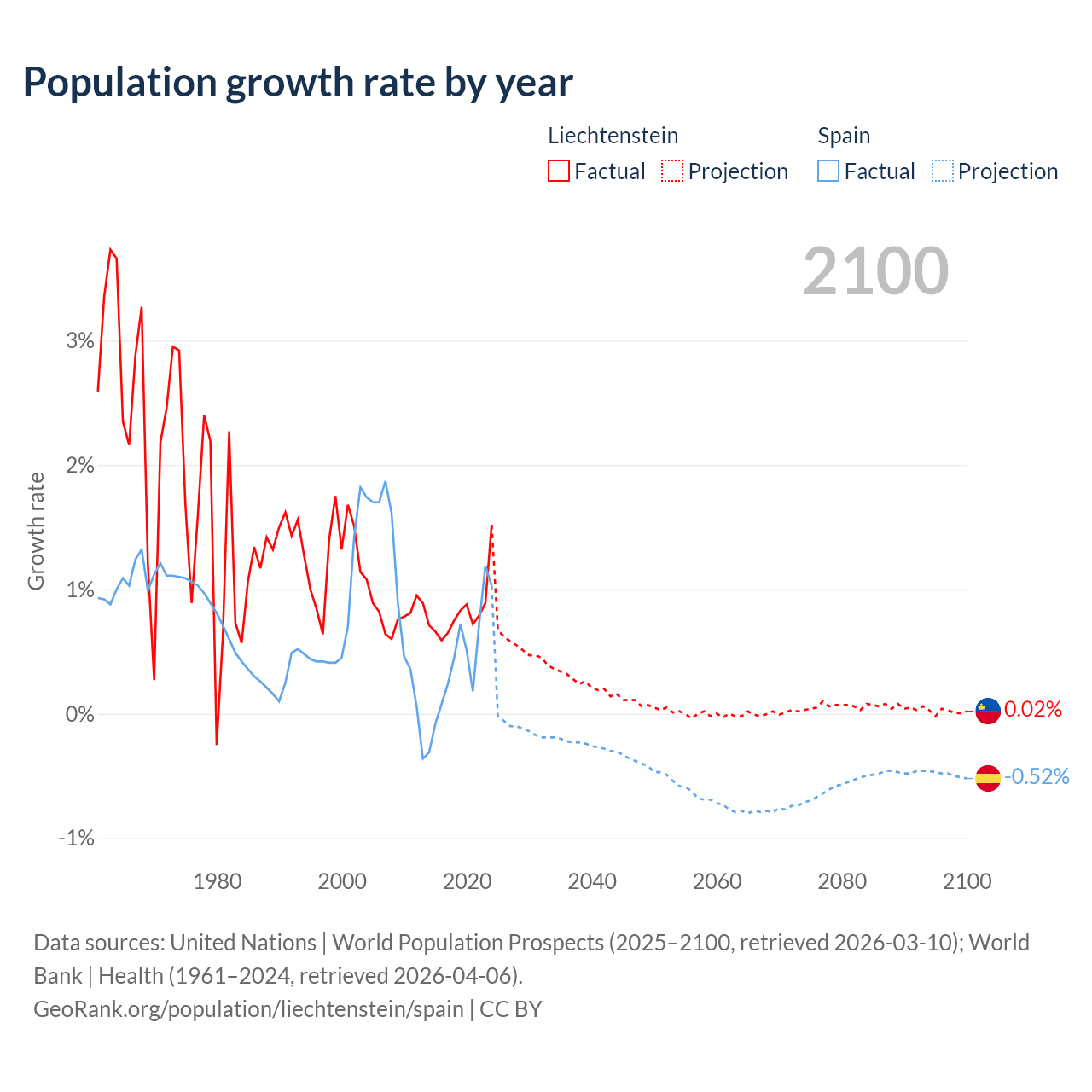 - For the last 10 years, Liechtenstein has had an average growth rate of +0.82% per year vs +0.43% in Spain.