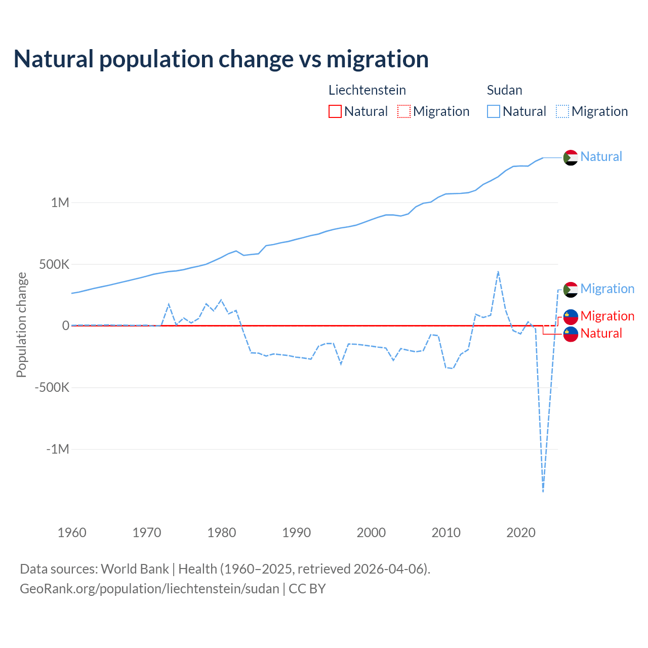 Over the last 10 years, 32.4% of the population change in Liechtenstein is from natural causes (a gain of 883 people) and 67.6% is from migration (a gain of 1,843 people). In Sudan 95.1% is from natural causes (a gain of 12,459,977 people) and 4.88% is from migration (a loss of 639,596 people).
