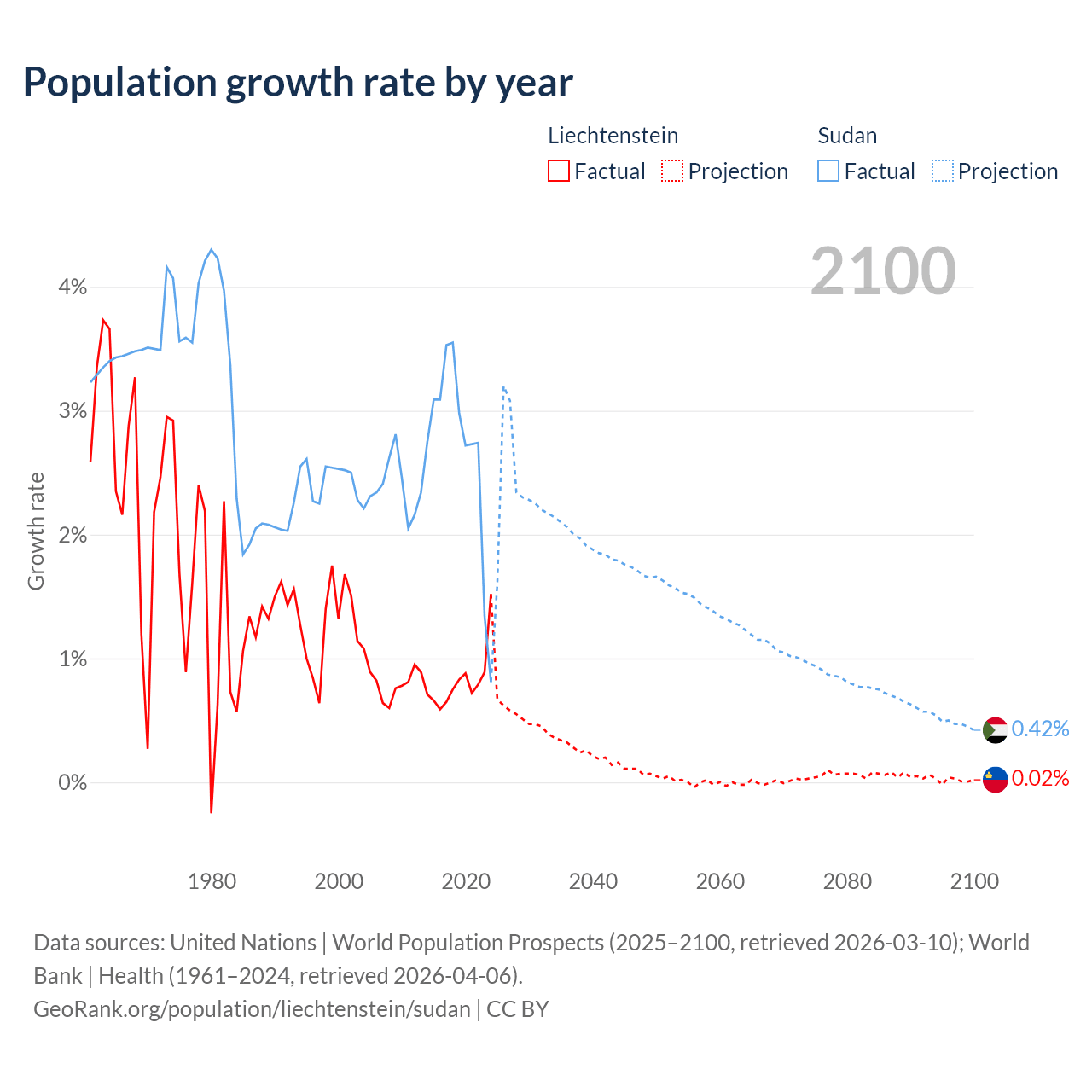 - For the last 10 years, Liechtenstein has had an average growth rate of +0.82% per year vs +2.67% in Sudan.