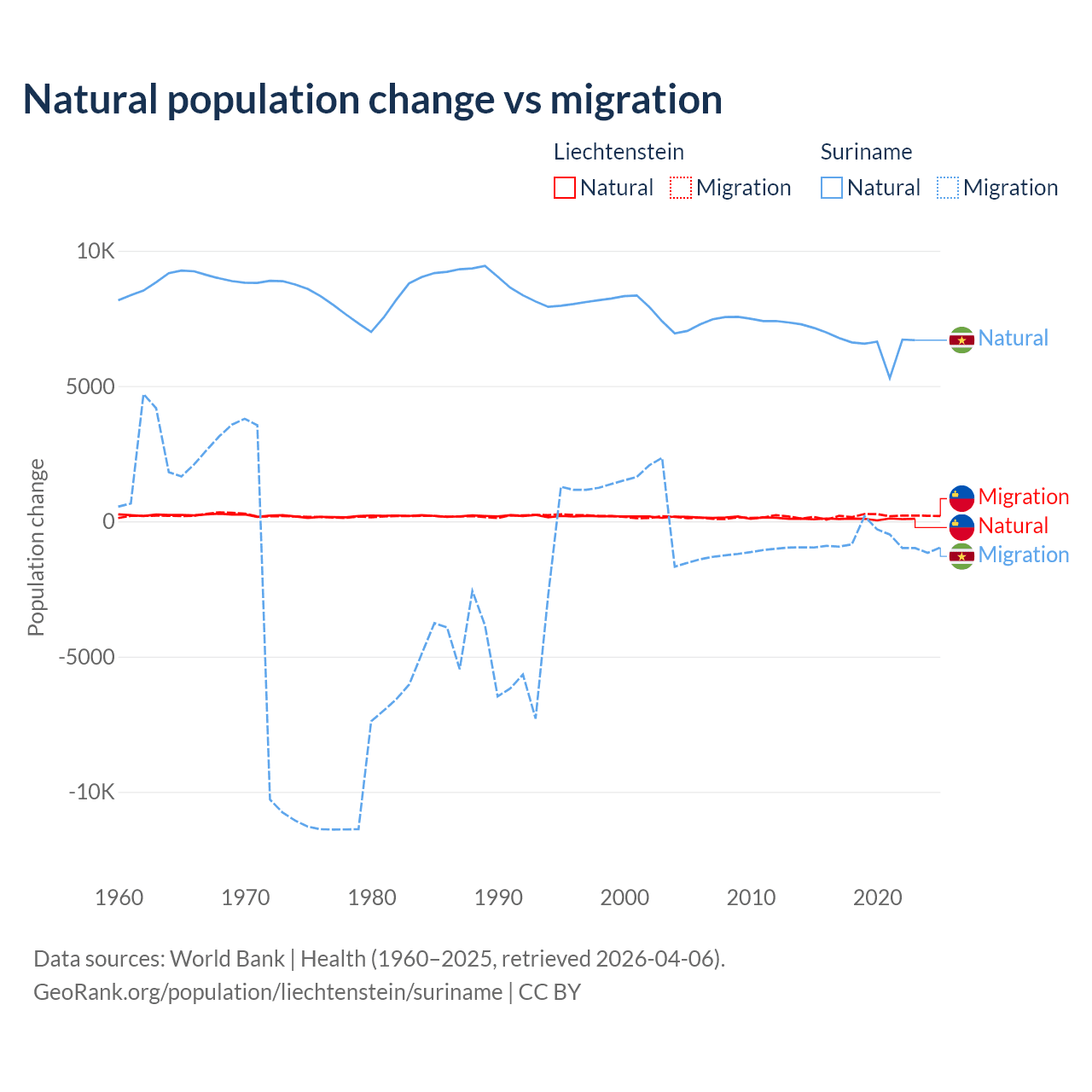 Over the last 10 years, 32.4% of the population change in Liechtenstein is from natural causes (a gain of 883 people) and 67.6% is from migration (a gain of 1,843 people). In Suriname 90.3% is from natural causes (a gain of 66,709 people) and 9.72% is from migration (a loss of 7,185 people).