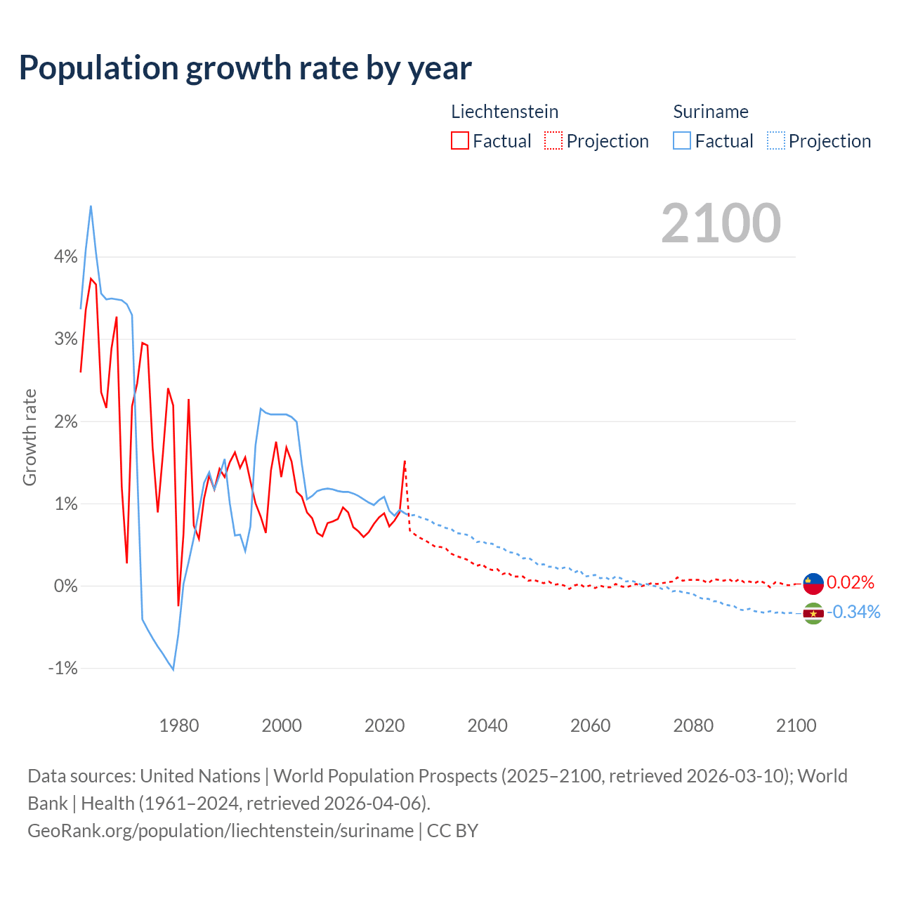 - For the last 10 years, Liechtenstein has had an average growth rate of +0.82% per year vs +0.99% in Suriname.