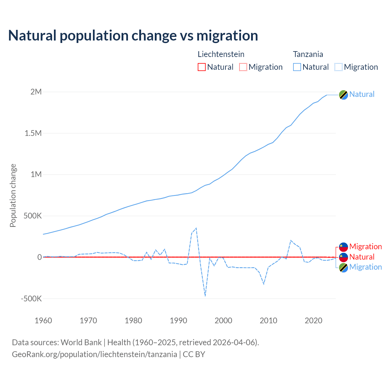 Over the last 10 years, 32.4% of the population change in Liechtenstein is from natural causes (a gain of 883 people) and 67.6% is from migration (a gain of 1,843 people). In Tanzania 98.7% is from natural causes (a gain of 17,769,541 people) and 1.27% is from migration (a gain of 229,466 people).