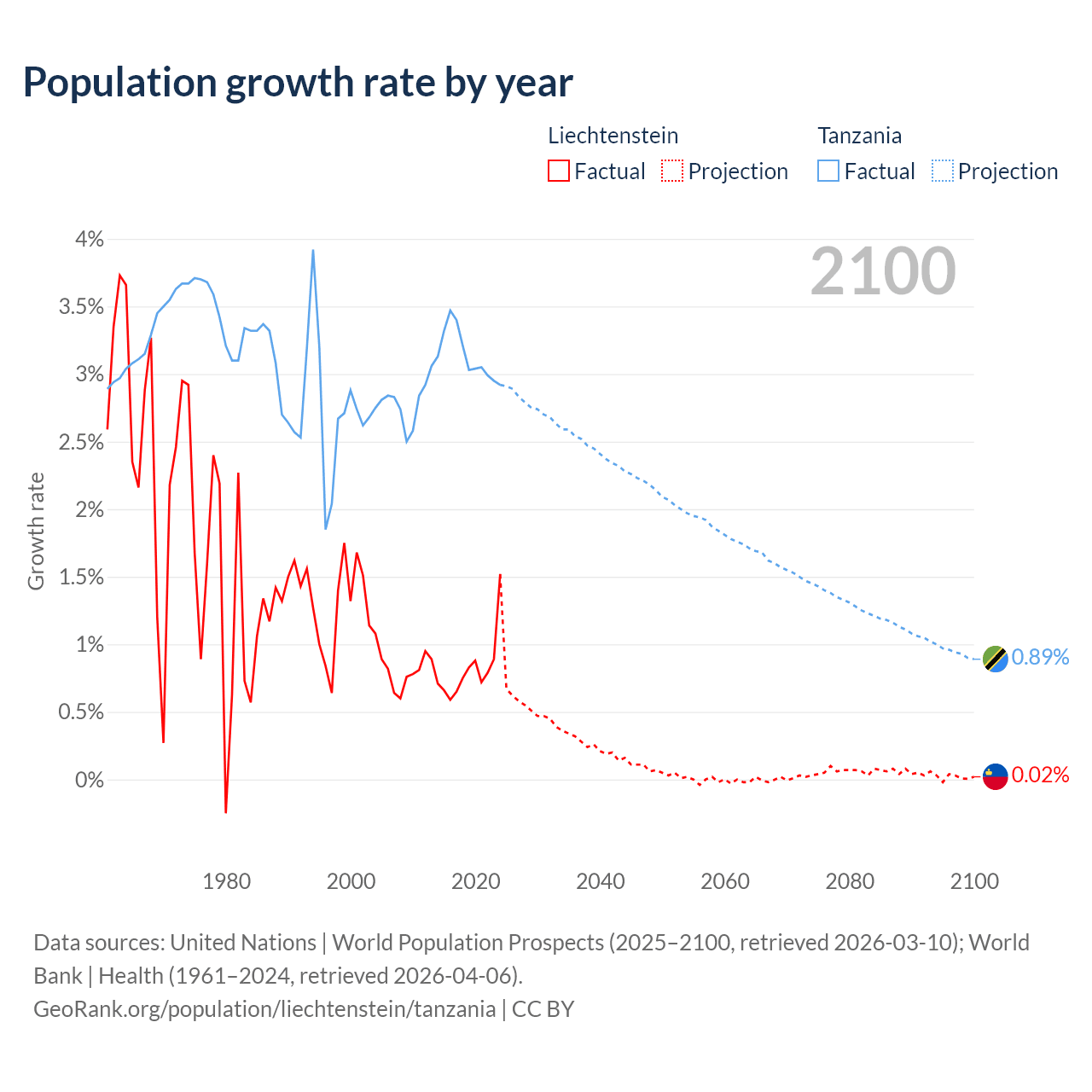 - For the last 10 years, Liechtenstein has had an average growth rate of +0.82% per year vs +3.13% in Tanzania.