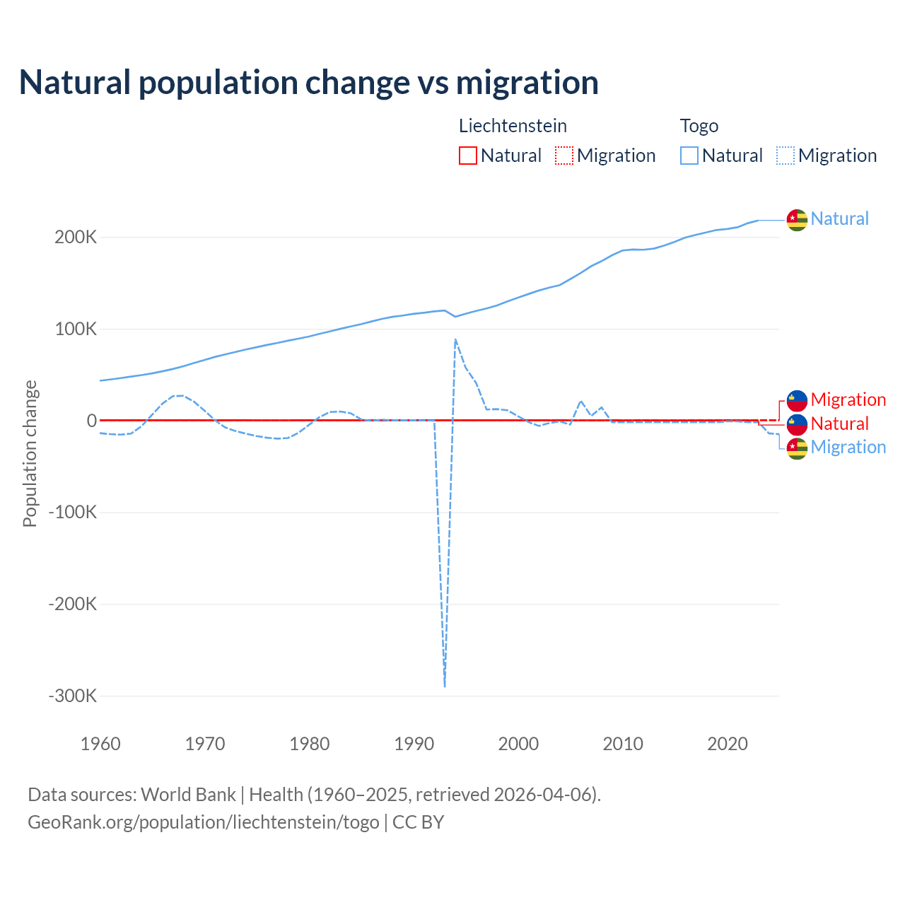 Over the last 10 years, 32.4% of the population change in Liechtenstein is from natural causes (a gain of 883 people) and 67.6% is from migration (a gain of 1,843 people). In Togo 99.1% is from natural causes (a gain of 2,052,115 people) and 0.86% is from migration (a loss of 17,852 people).