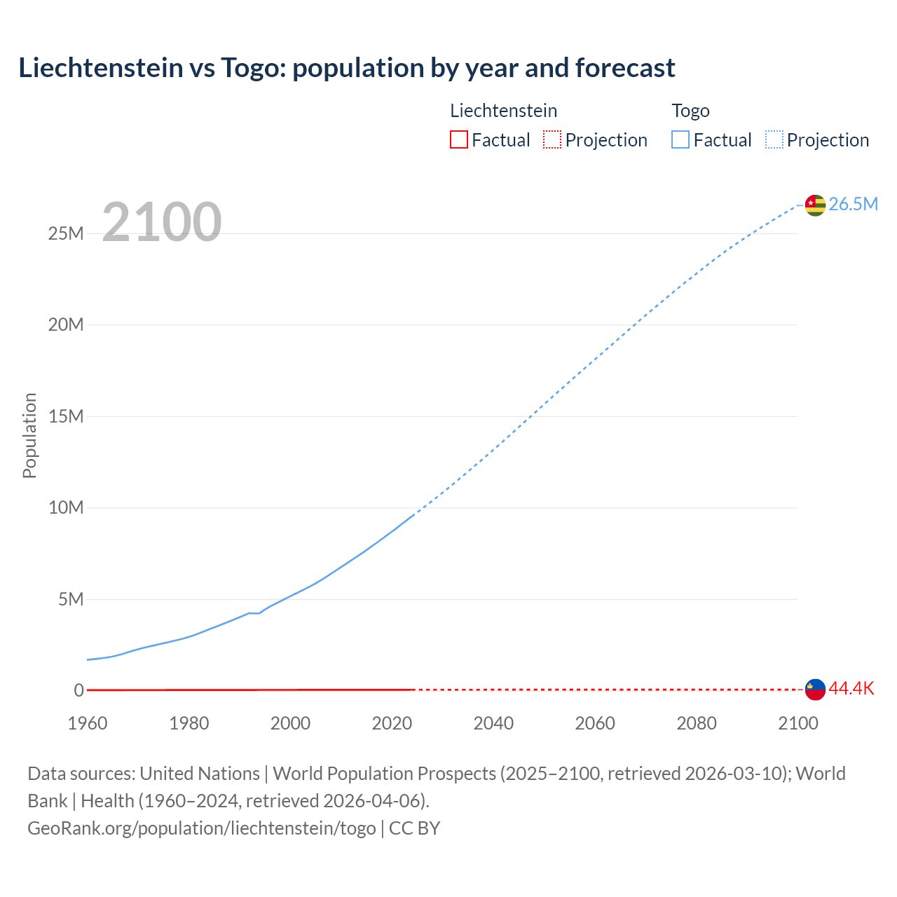 Liechtenstein vs Togo: population by year and forecast