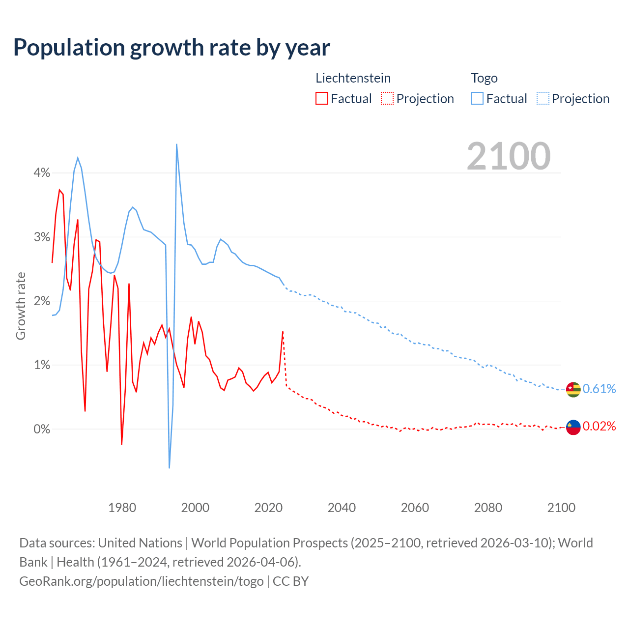 - For the last 10 years, Liechtenstein has had an average growth rate of +0.82% per year vs +2.46% in Togo.