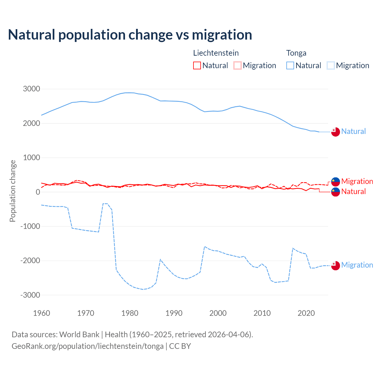 Over the last 10 years, 32.4% of the population change in Liechtenstein is from natural causes (a gain of 883 people) and 67.6% is from migration (a gain of 1,843 people). In Tonga 46.9% is from natural causes (a gain of 18,919 people) and 53.1% is from migration (a loss of 21,384 people).