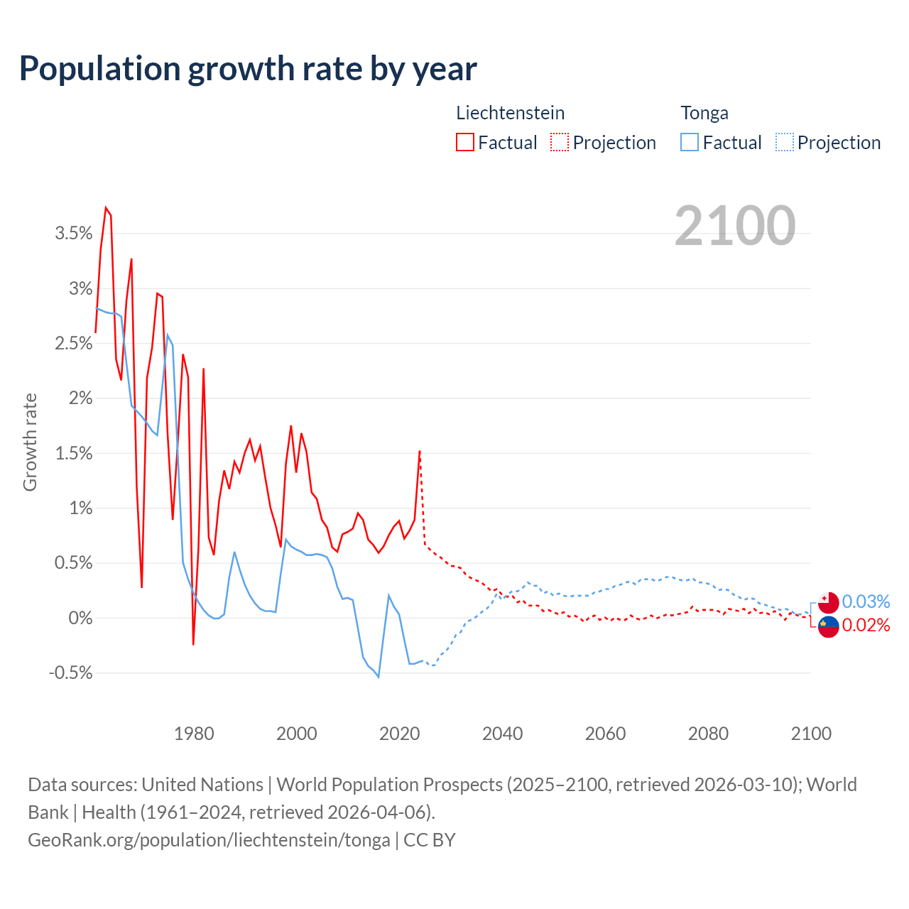 - For the last 10 years, Liechtenstein has had an average growth rate of +0.82% per year vs -0.25% in Tonga.