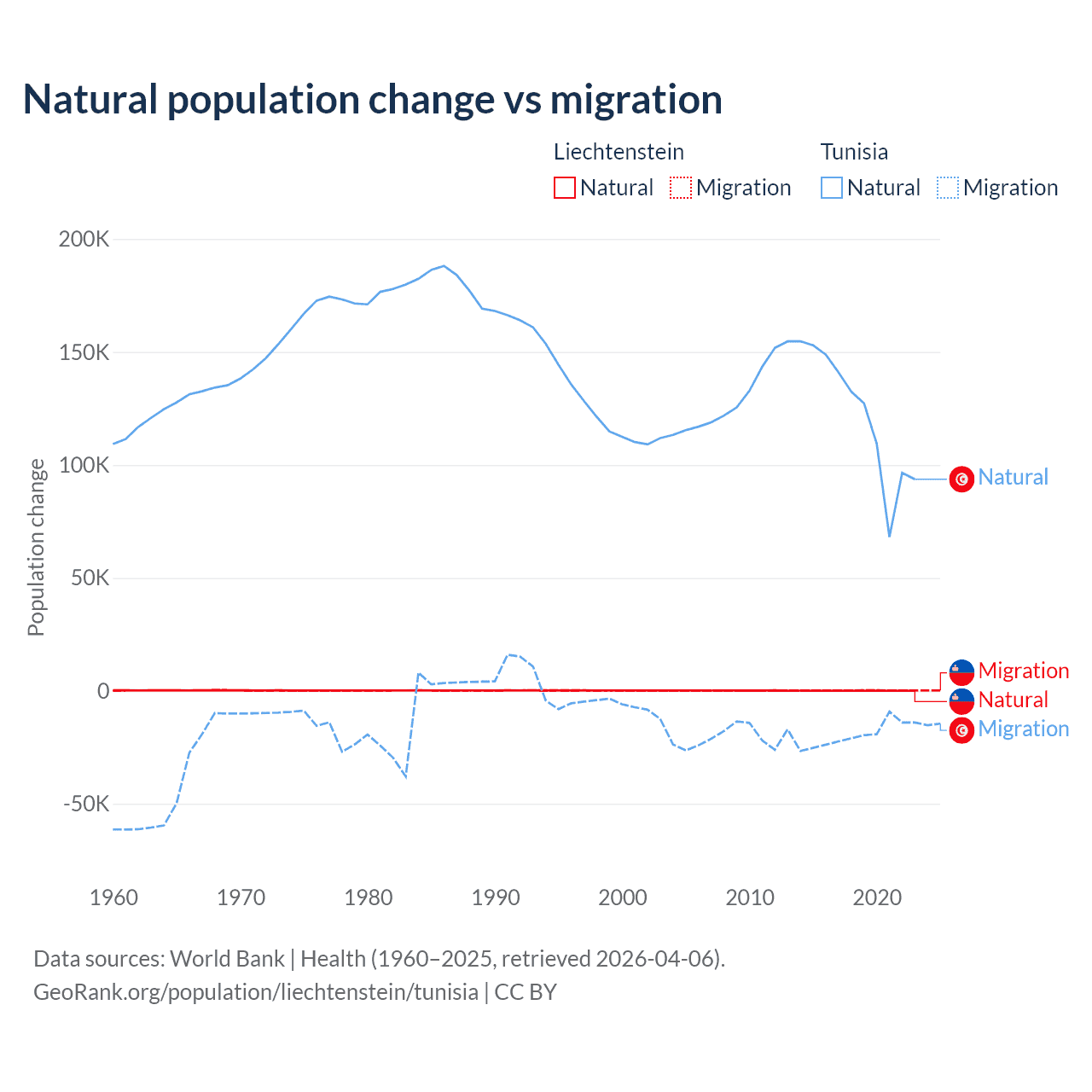 Over the last 10 years, 32.4% of the population change in Liechtenstein is from natural causes (a gain of 883 people) and 67.6% is from migration (a gain of 1,843 people). In Tunisia 86.3% is from natural causes (a gain of 1,225,079 people) and 13.7% is from migration (a loss of 195,011 people).