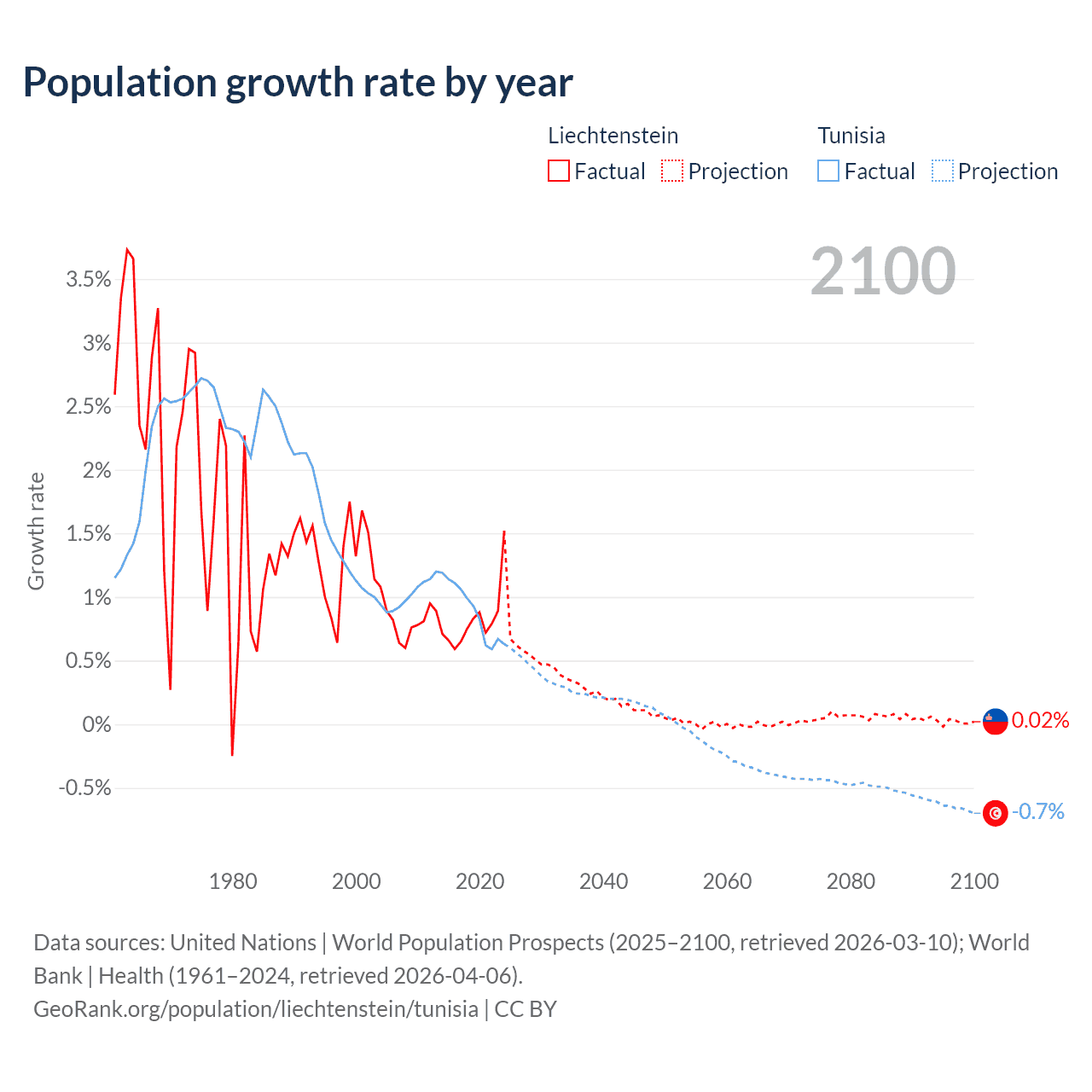 - For the last 10 years, Liechtenstein has had an average growth rate of +0.82% per year vs +0.89% in Tunisia.