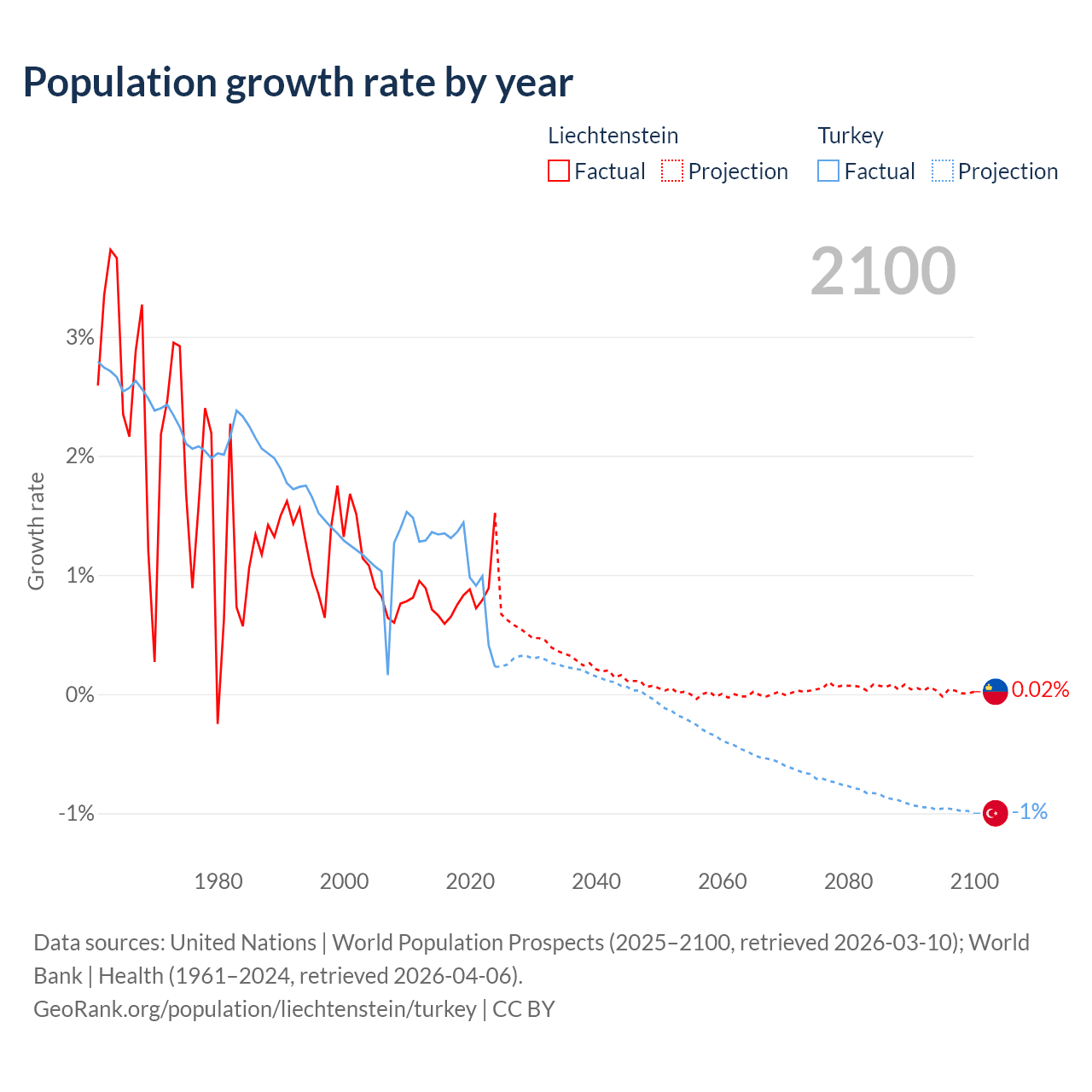 - For the last 10 years, Liechtenstein has had an average growth rate of +0.82% per year vs +1.06% in Turkey.