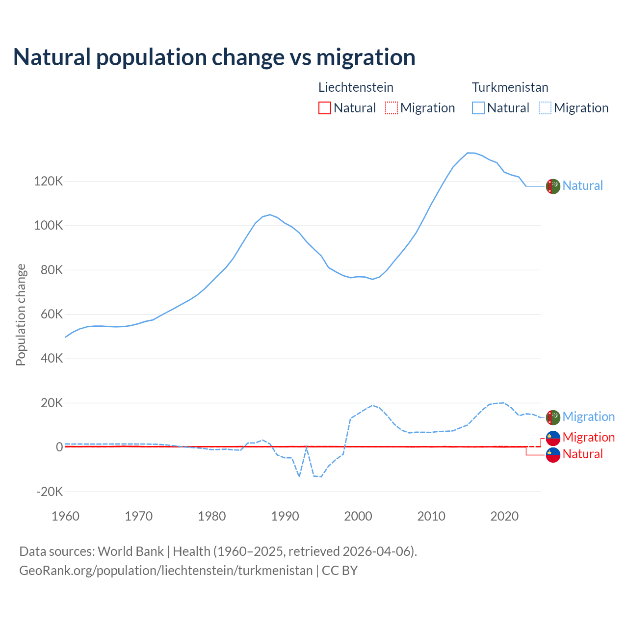 Over the last 10 years, 32.4% of the population change in Liechtenstein is from natural causes (a gain of 883 people) and 67.6% is from migration (a gain of 1,843 people). In Turkmenistan 89.2% is from natural causes (a gain of 1,270,228 people) and 10.8% is from migration (a gain of 154,379 people).