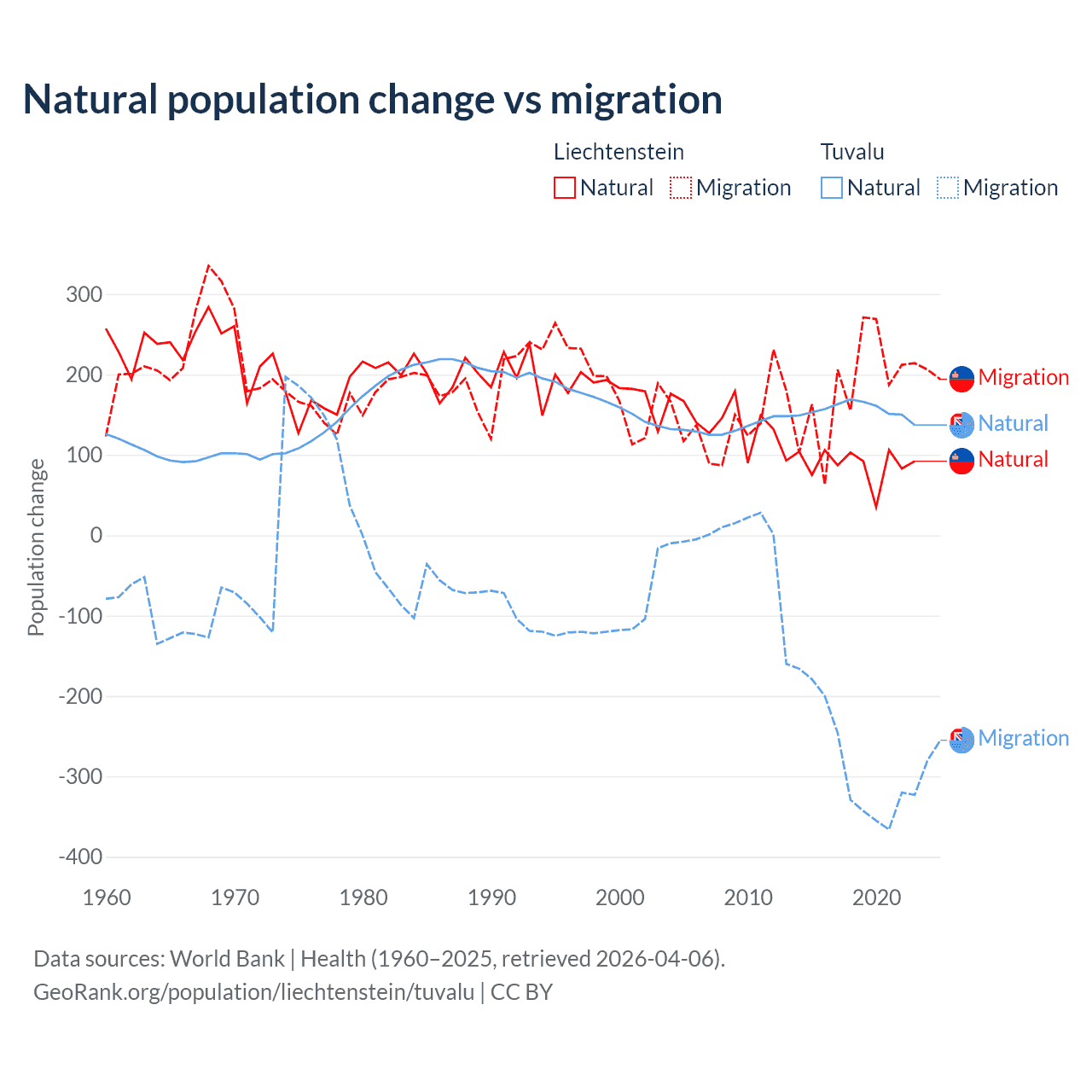 Over the last 10 years, 32.4% of the population change in Liechtenstein is from natural causes (a gain of 883 people) and 67.6% is from migration (a gain of 1,843 people). In Tuvalu 35.5% is from natural causes (a gain of 1,556 people) and 64.5% is from migration (a loss of 2,827 people).