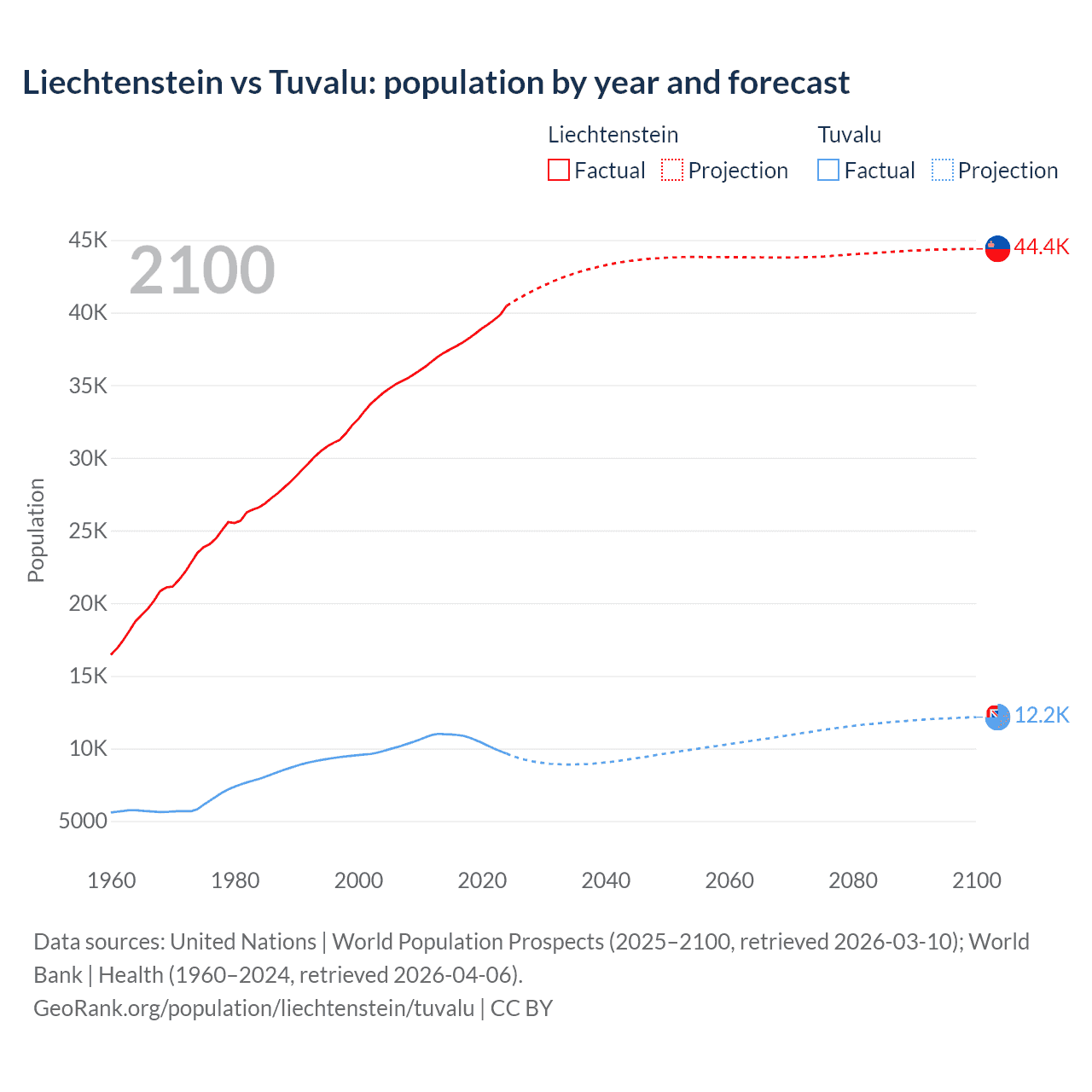 Liechtenstein vs Tuvalu: population by year and forecast