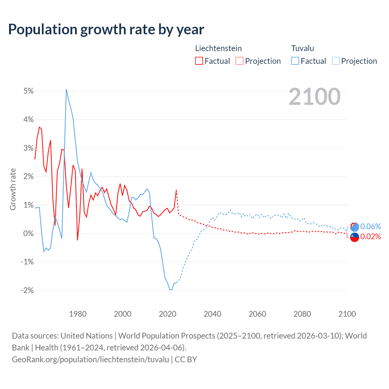- For the last 10 years, Liechtenstein has had an average growth rate of +0.82% per year vs -1.19% in Tuvalu.