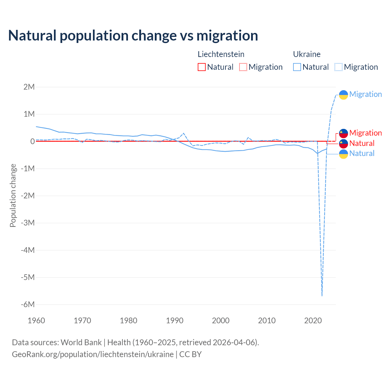 Over the last 10 years, 32.4% of the population change in Liechtenstein is from natural causes (a gain of 883 people) and 67.6% is from migration (a gain of 1,843 people). In Ukraine 28.2% is from natural causes (a loss of 2,435,153 people) and 71.8% is from migration (a loss of 6,198,995 people).