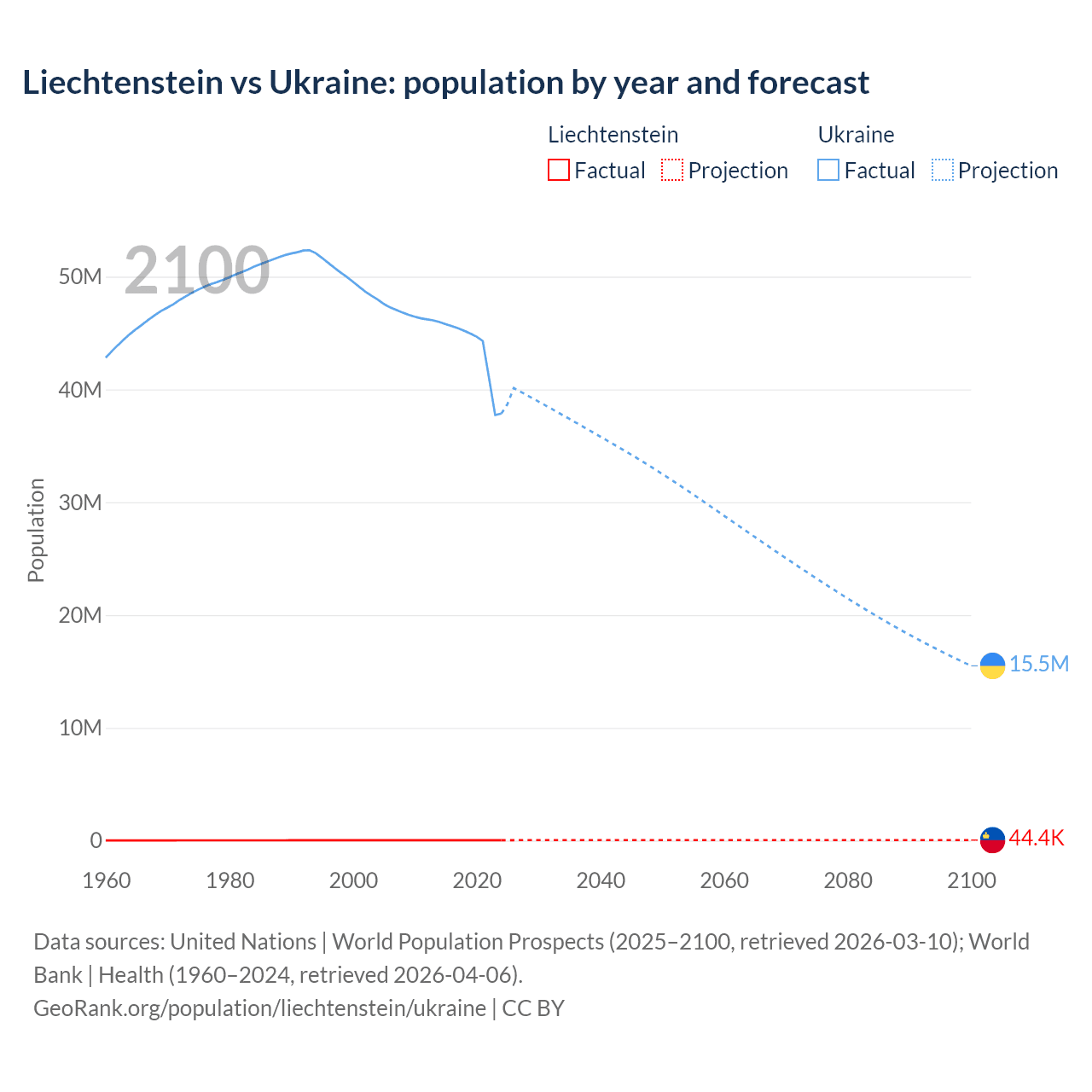 Liechtenstein vs Ukraine: population by year and forecast