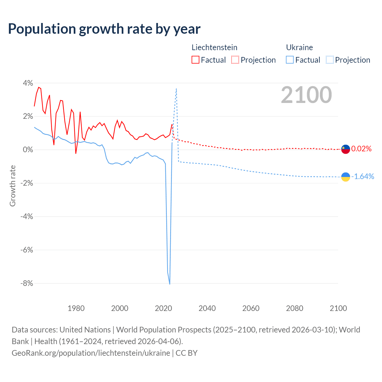 - For the last 10 years, Liechtenstein has had an average growth rate of +0.82% per year vs -1.74% in Ukraine.