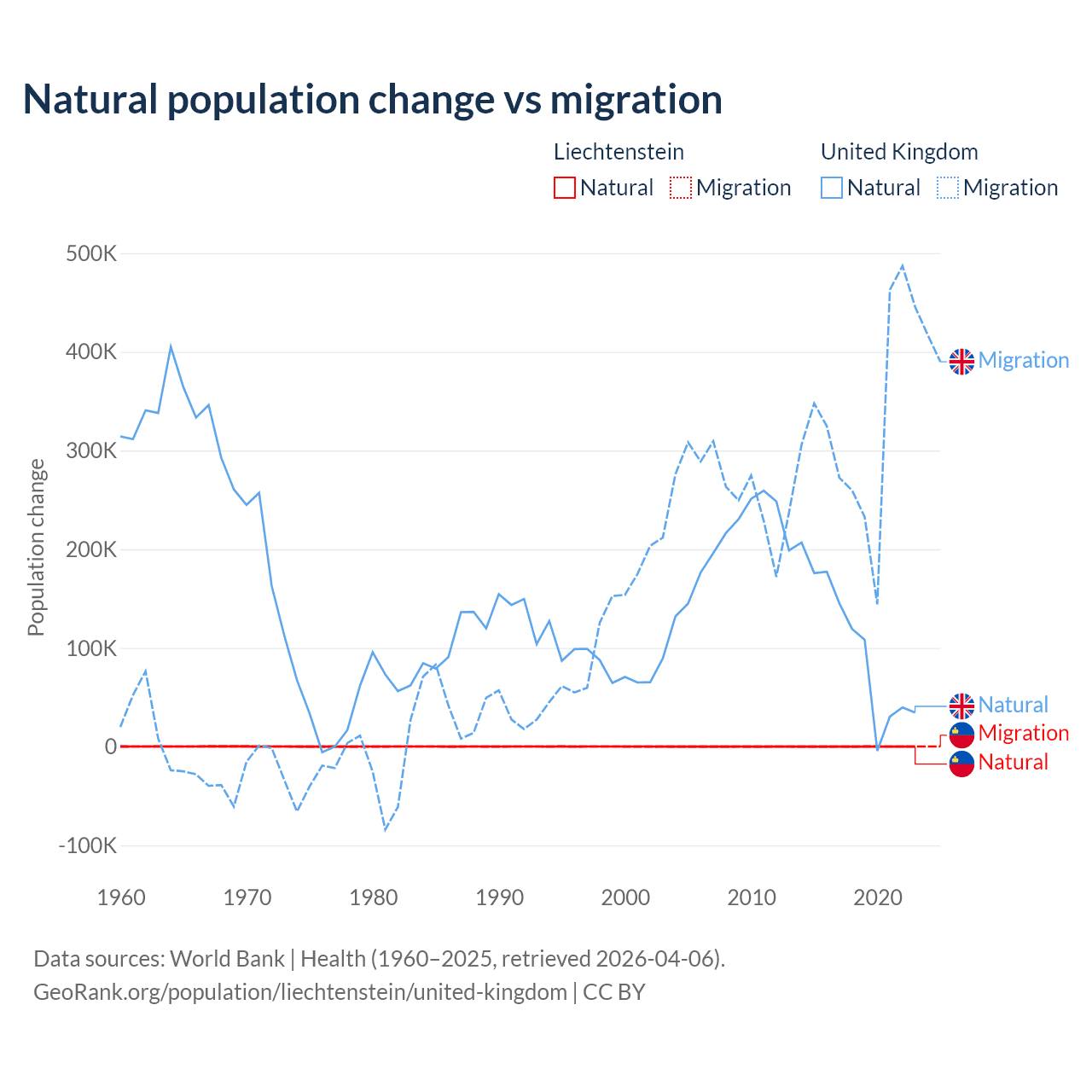 Over the last 10 years, 32.4% of the population change in Liechtenstein is from natural causes (a gain of 883 people) and 67.6% is from migration (a gain of 1,843 people). In the United Kingdom 23.9% is from natural causes (a gain of 1,033,129 people) and 76.1% is from migration (a gain of 3,283,101 people).