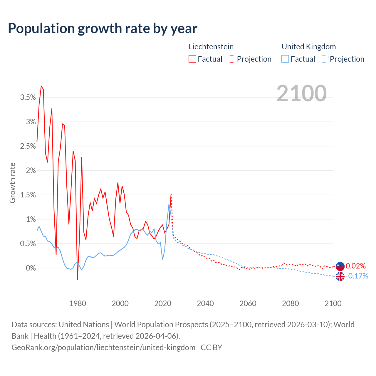 - For the last 10 years, Liechtenstein has had an average growth rate of +0.82% per year vs +0.7% in the United Kingdom.