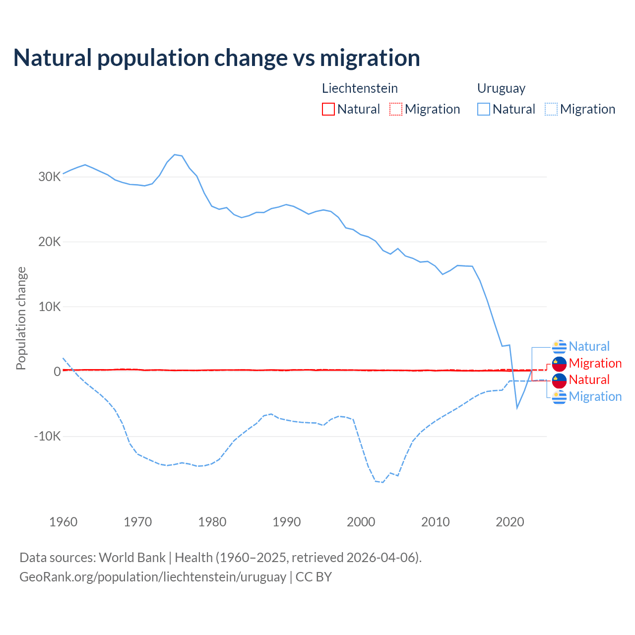 Over the last 10 years, 32.4% of the population change in Liechtenstein is from natural causes (a gain of 883 people) and 67.6% is from migration (a gain of 1,843 people). In Uruguay 70% is from natural causes (a gain of 64,303 people) and 30% is from migration (a loss of 27,501 people).