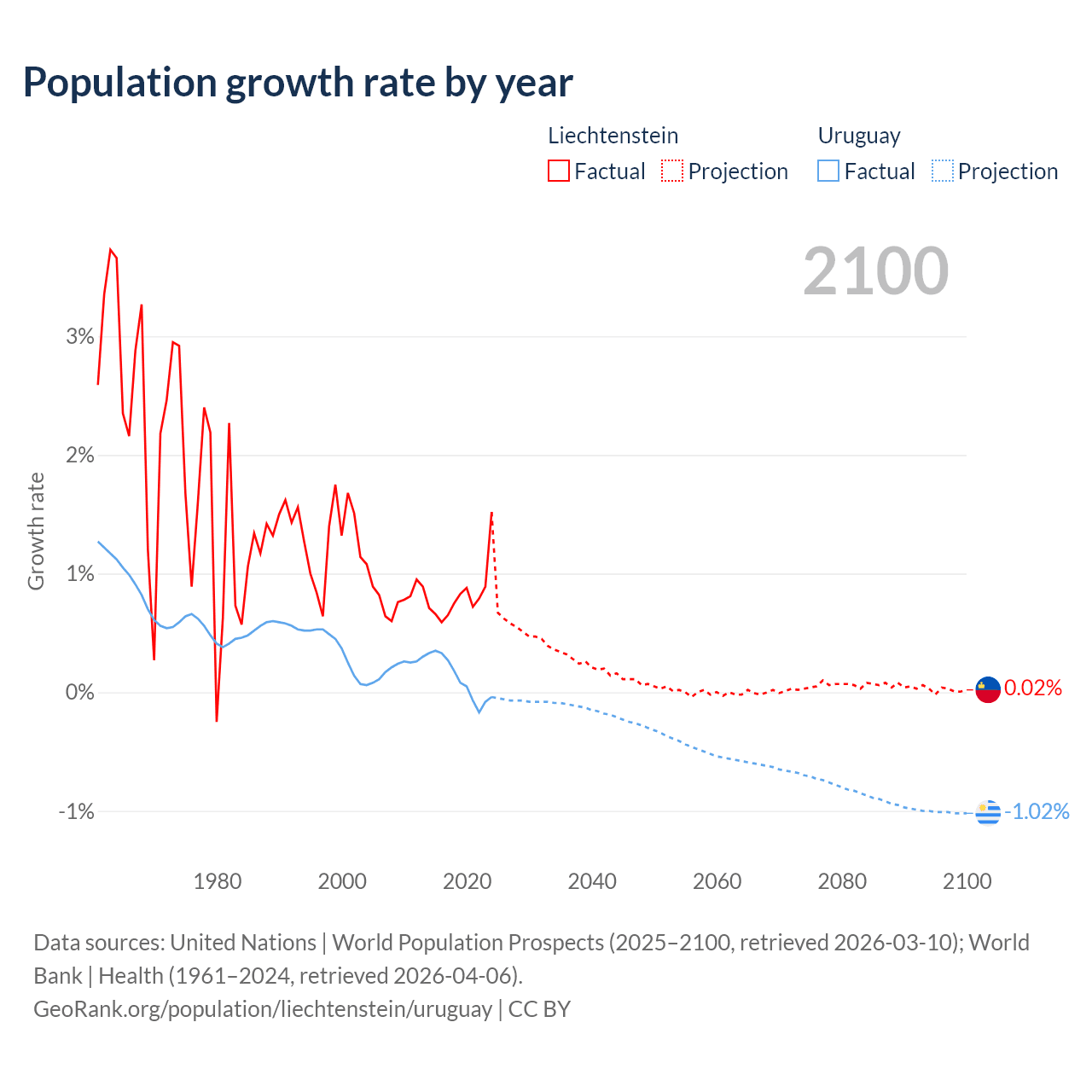 - For the last 10 years, Liechtenstein has had an average growth rate of +0.82% per year vs +0.11% in Uruguay.
