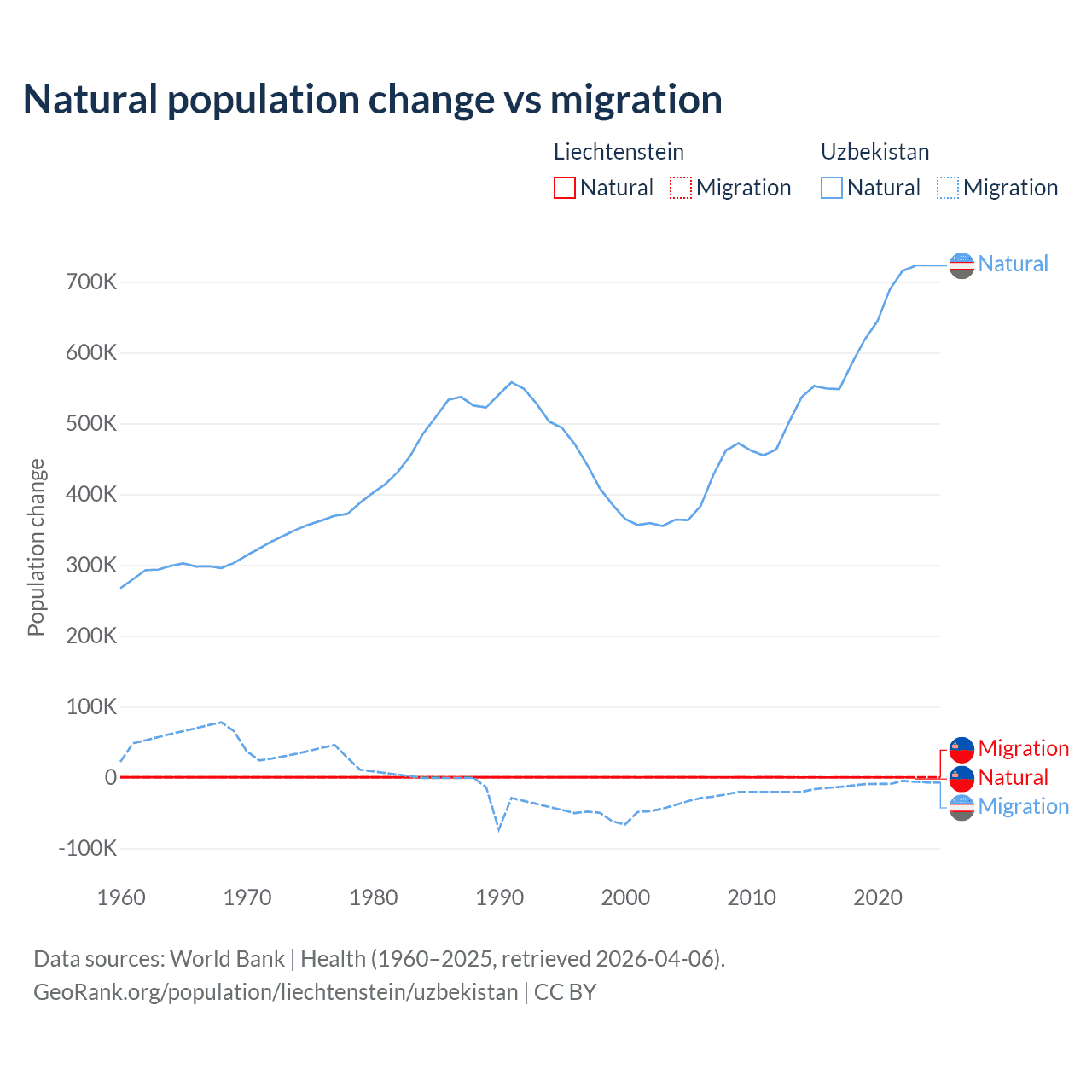 Over the last 10 years, 32.4% of the population change in Liechtenstein is from natural causes (a gain of 883 people) and 67.6% is from migration (a gain of 1,843 people). In Uzbekistan 98.2% is from natural causes (a gain of 6,161,117 people) and 1.84% is from migration (a loss of 115,398 people).