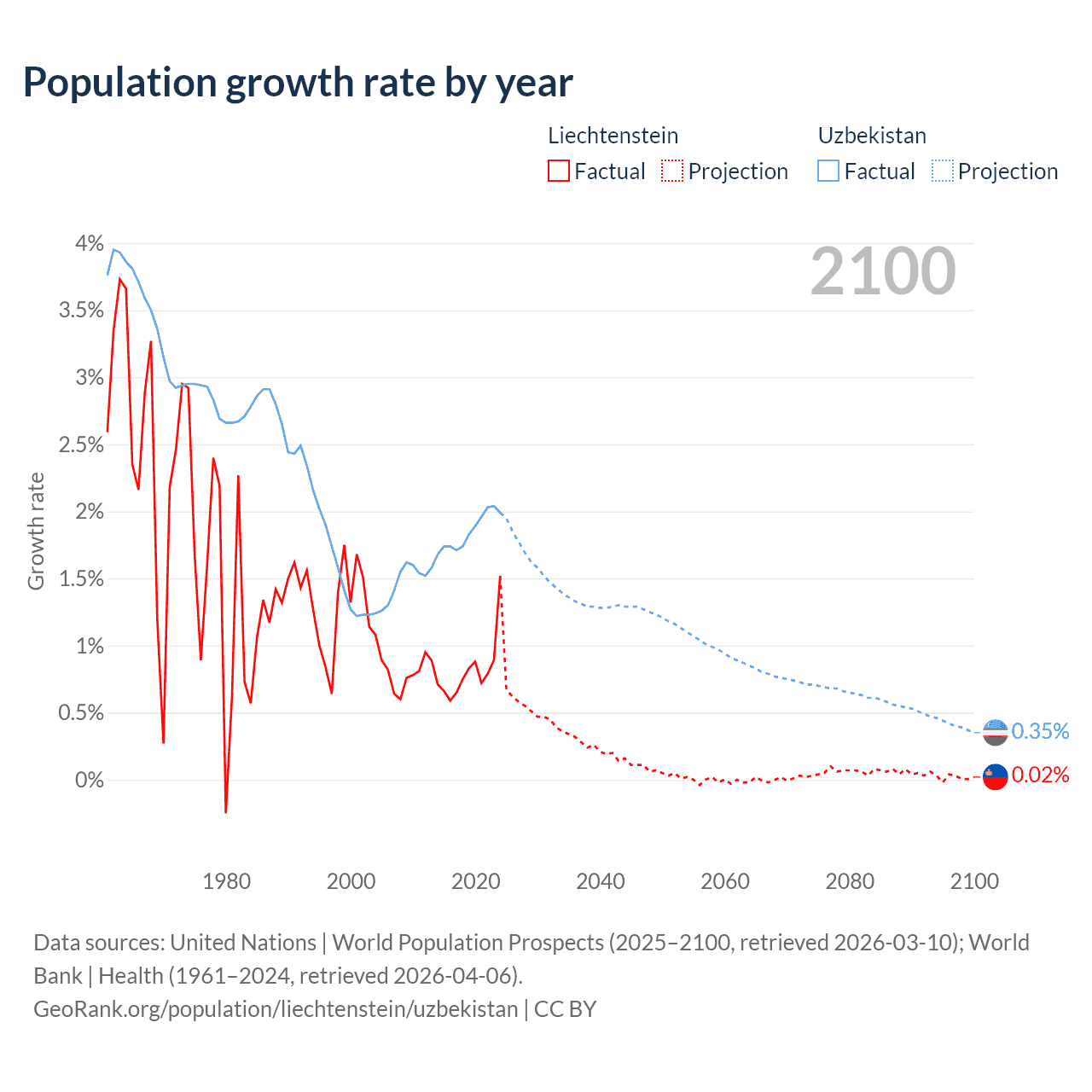 - For the last 10 years, Liechtenstein has had an average growth rate of +0.82% per year vs +1.85% in Uzbekistan.