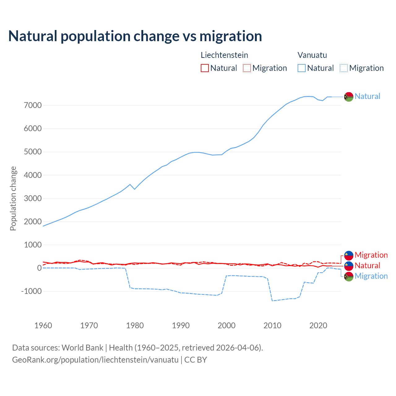 Over the last 10 years, 32.4% of the population change in Liechtenstein is from natural causes (a gain of 883 people) and 67.6% is from migration (a gain of 1,843 people). In Vanuatu 92.2% is from natural causes (a gain of 72,941 people) and 7.81% is from migration (a loss of 6,181 people).