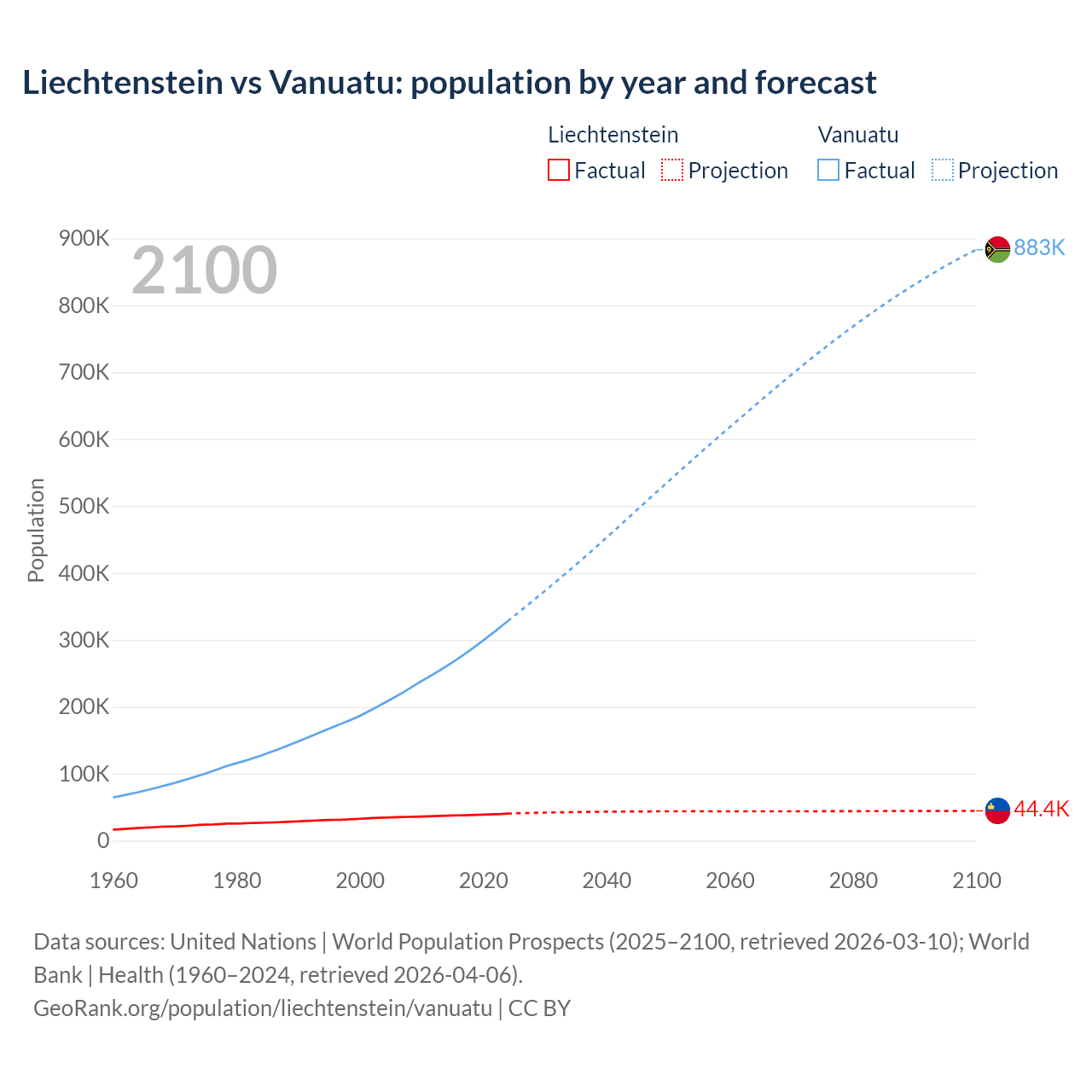Liechtenstein vs Vanuatu: population by year and forecast