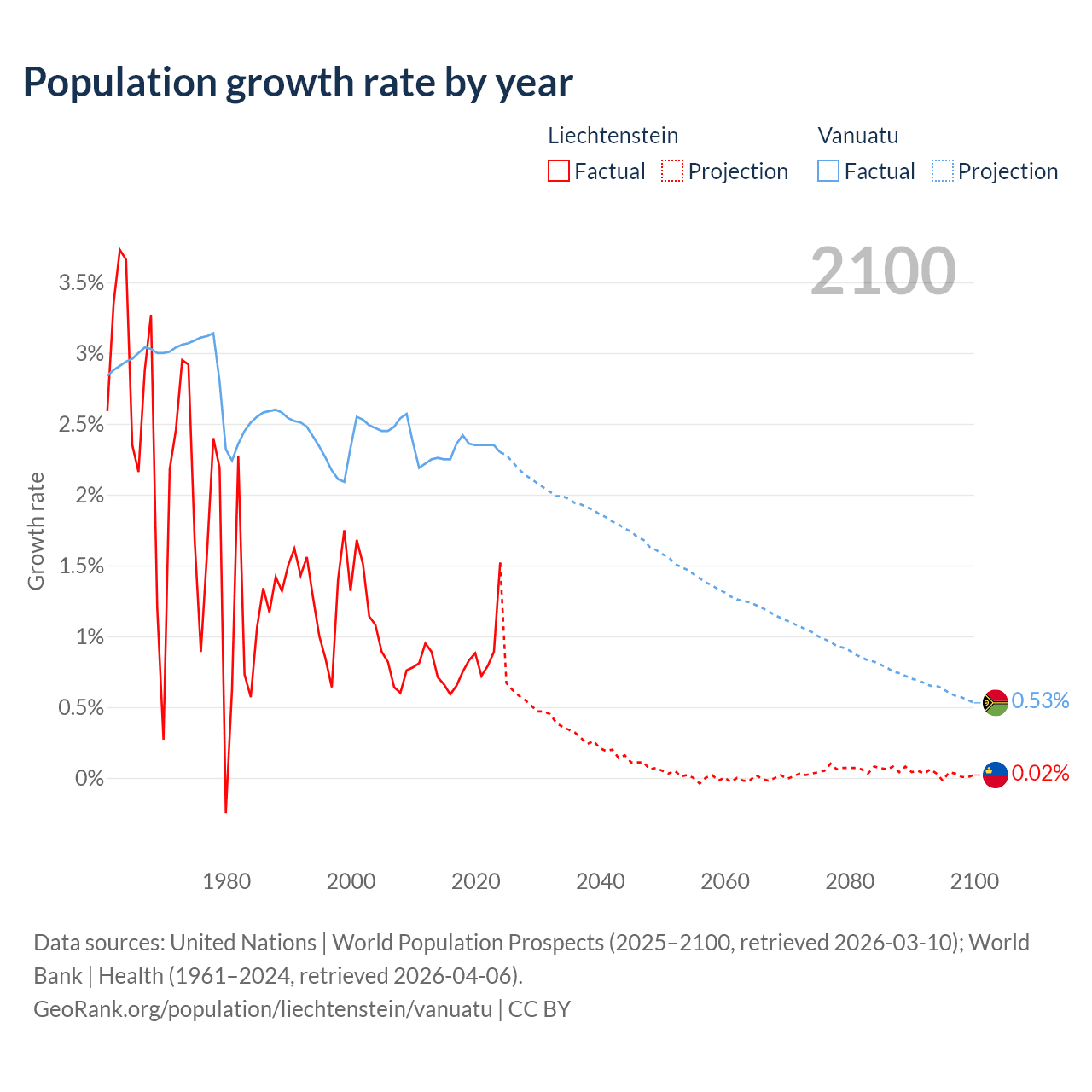 - For the last 10 years, Liechtenstein has had an average growth rate of +0.82% per year vs +2.33% in Vanuatu.