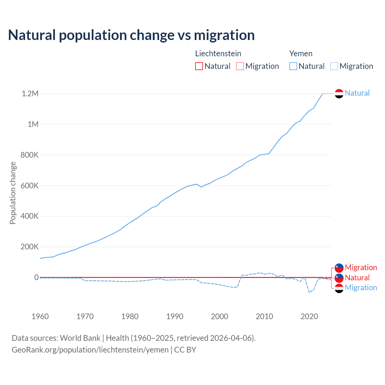 Over the last 10 years, 32.4% of the population change in Liechtenstein is from natural causes (a gain of 883 people) and 67.6% is from migration (a gain of 1,843 people). In Yemen 97.8% is from natural causes (a gain of 10,460,813 people) and 2.17% is from migration (a loss of 231,814 people).
