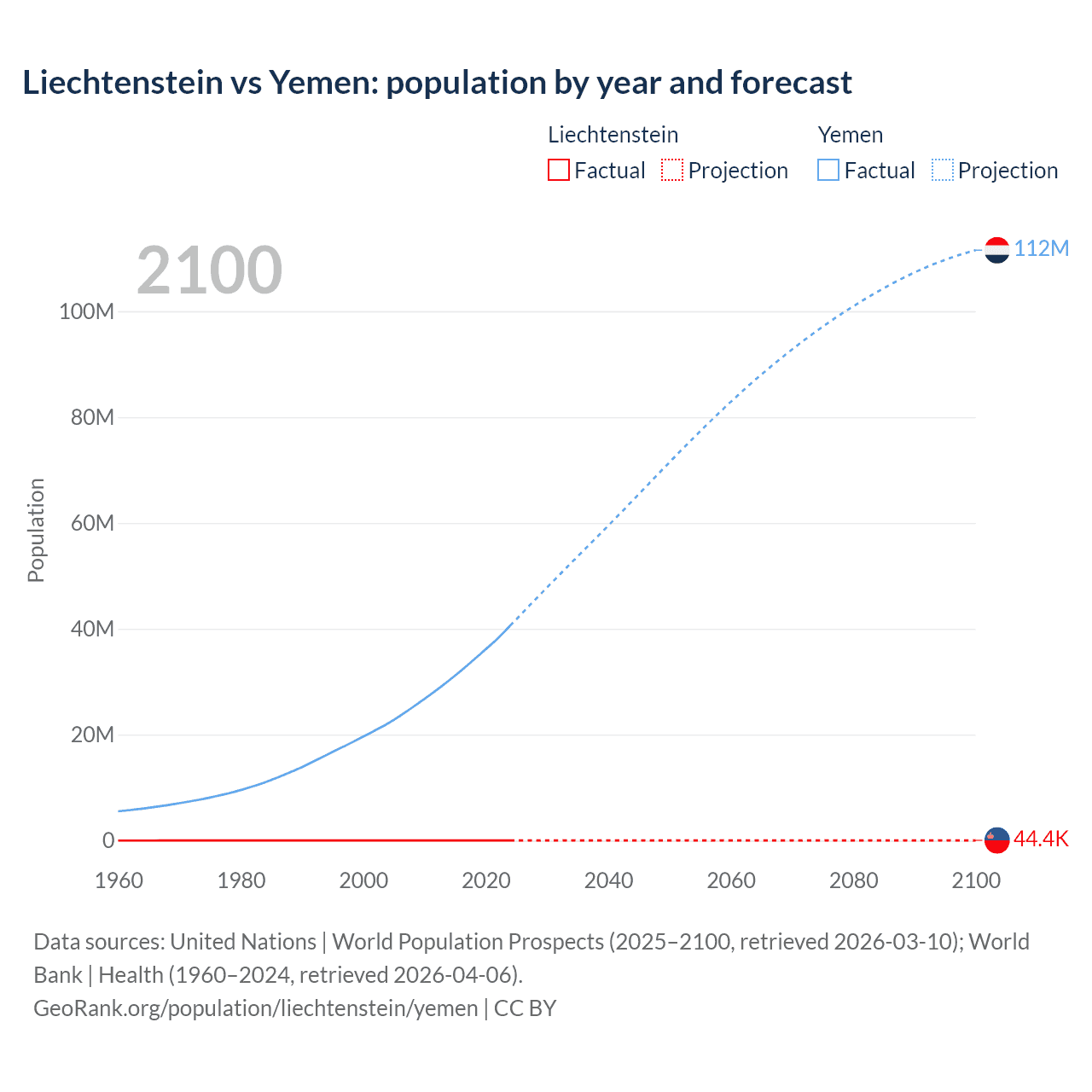 Liechtenstein vs Yemen: population by year and forecast