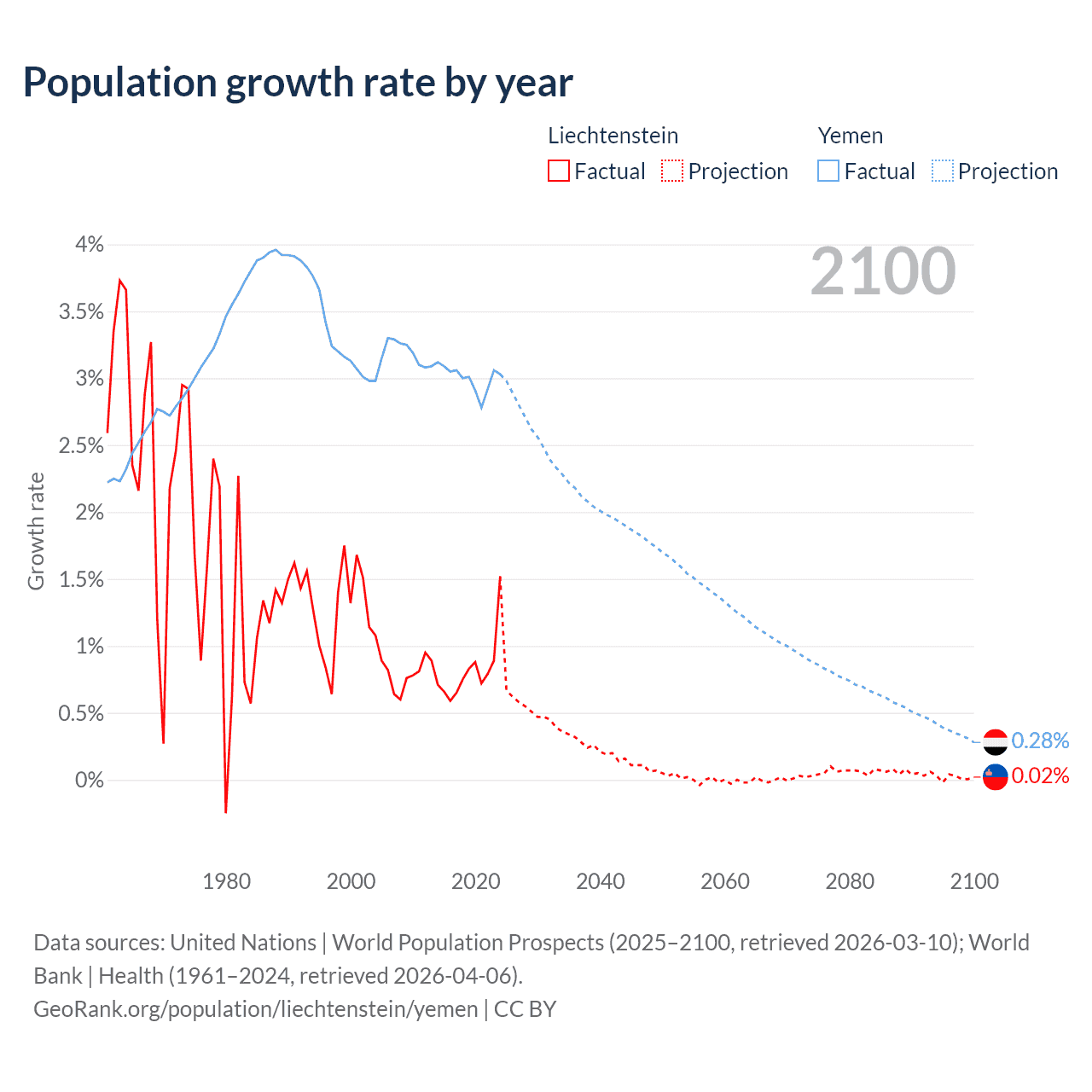 - For the last 10 years, Liechtenstein has had an average growth rate of +0.82% per year vs +3% in Yemen.