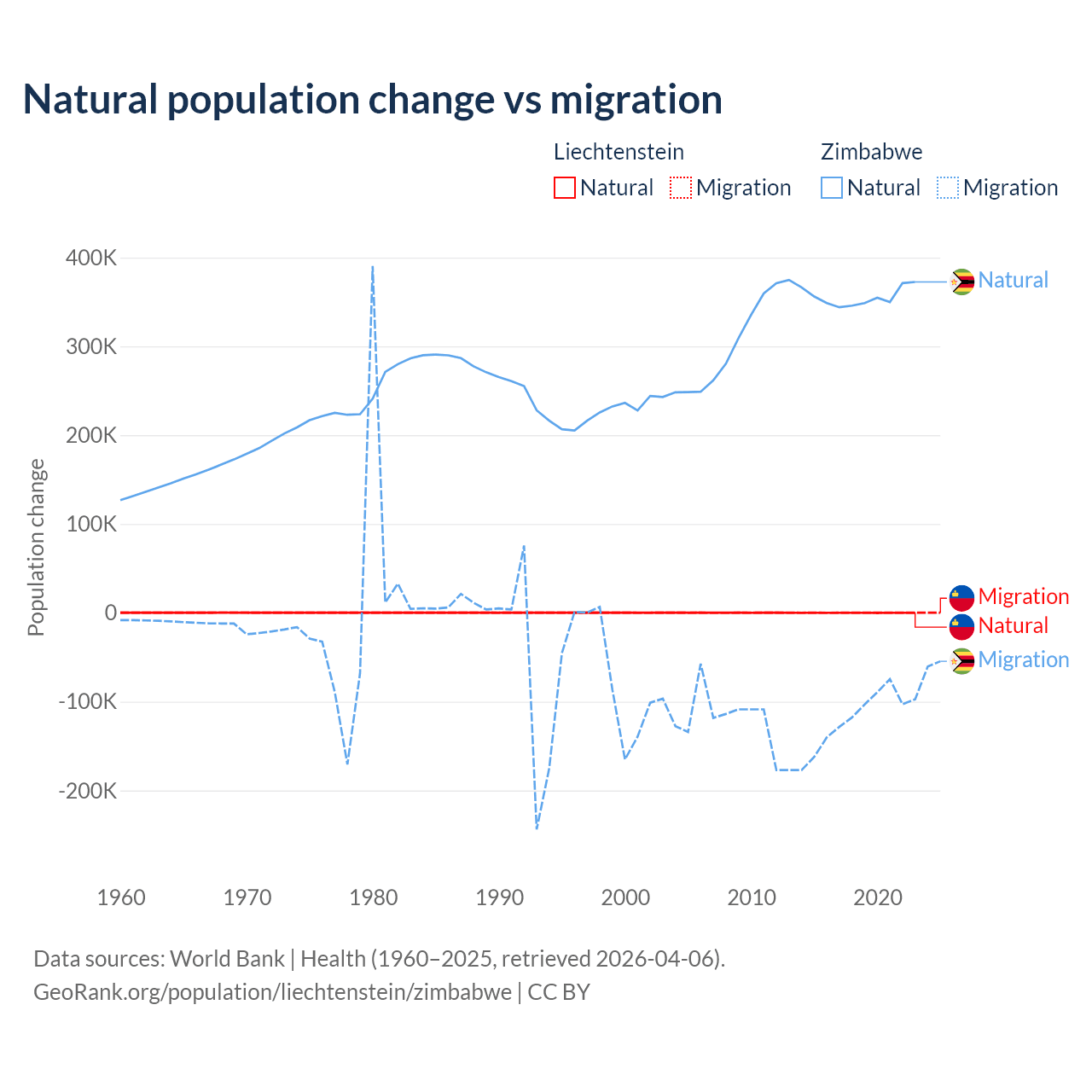 Over the last 10 years, 32.4% of the population change in Liechtenstein is from natural causes (a gain of 883 people) and 67.6% is from migration (a gain of 1,843 people). In Zimbabwe 74.9% is from natural causes (a gain of 3,558,487 people) and 25.1% is from migration (a loss of 1,192,807 people).