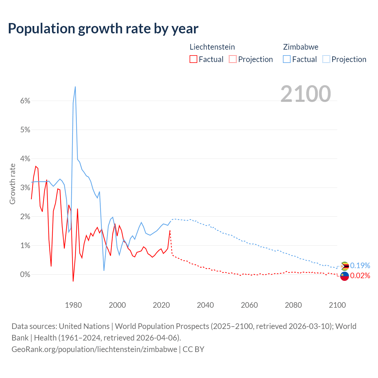 - For the last 10 years, Liechtenstein has had an average growth rate of +0.82% per year vs +1.57% in Zimbabwe.
