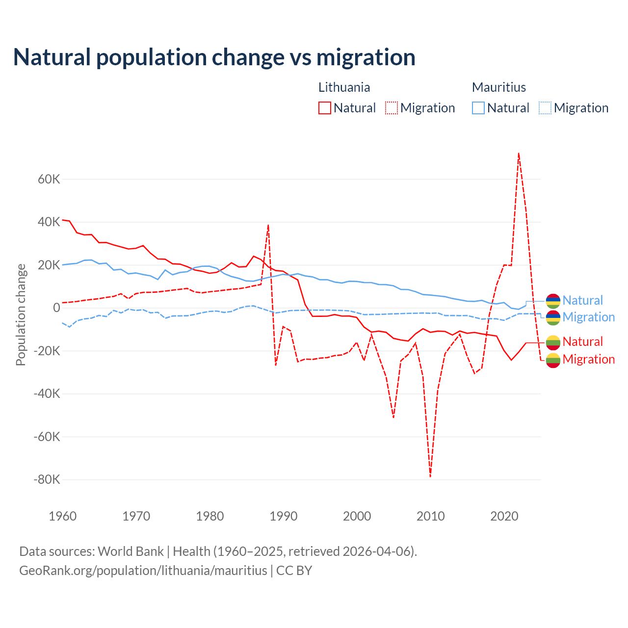 Over the last 10 years, 68.7% of the population change in Lithuania is from natural causes (a loss of 153,859 people) and 31.3% is from migration (a gain of 70,196 people). In Mauritius 30.9% is from natural causes (a gain of 19,327 people) and 69.1% is from migration (a loss of 43,294 people).