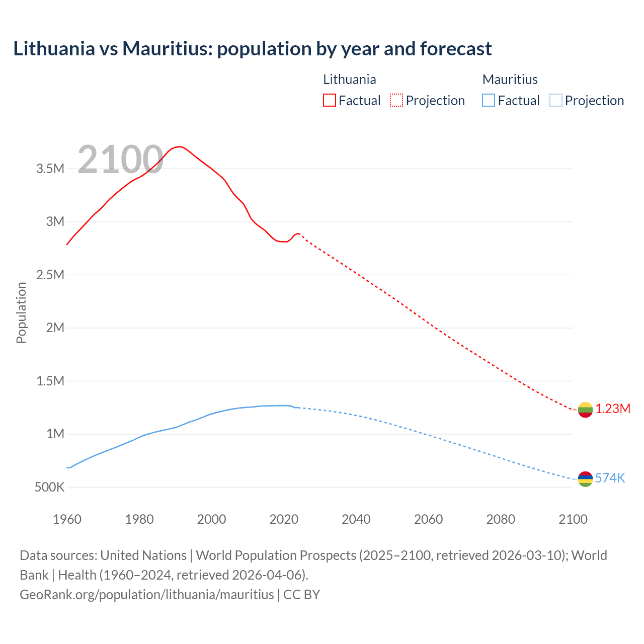 Lithuania vs Mauritius: population by year and forecast