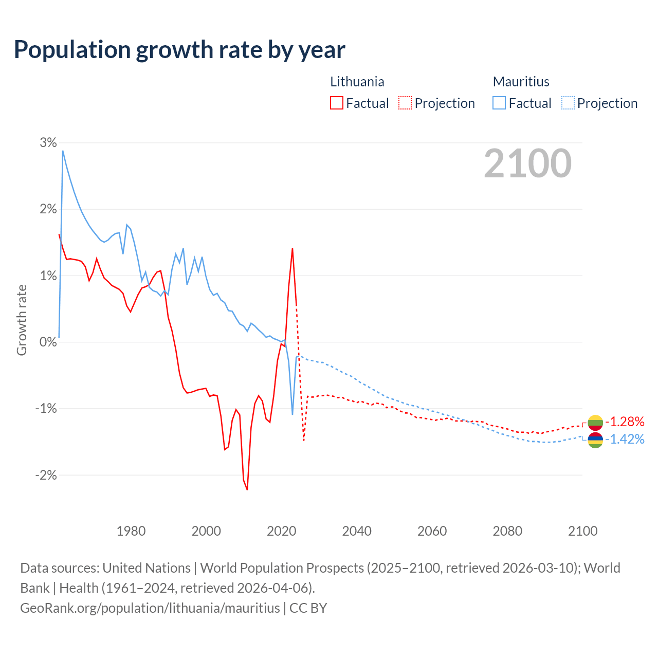 - For the last 10 years, Lithuania has had an average growth rate of -0.22% per year vs -0.09% in Mauritius.