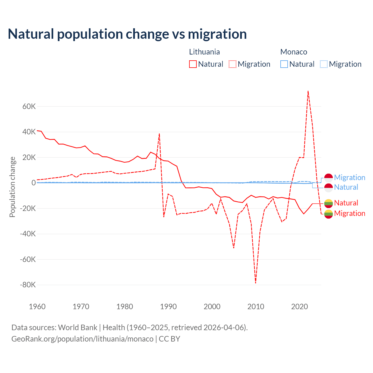 Over the last 10 years, 68.7% of the population change in Lithuania is from natural causes (a loss of 153,859 people) and 31.3% is from migration (a gain of 70,196 people). In Monaco 37.3% is from natural causes (a loss of 4,357 people) and 62.7% is from migration (a gain of 7,333 people).